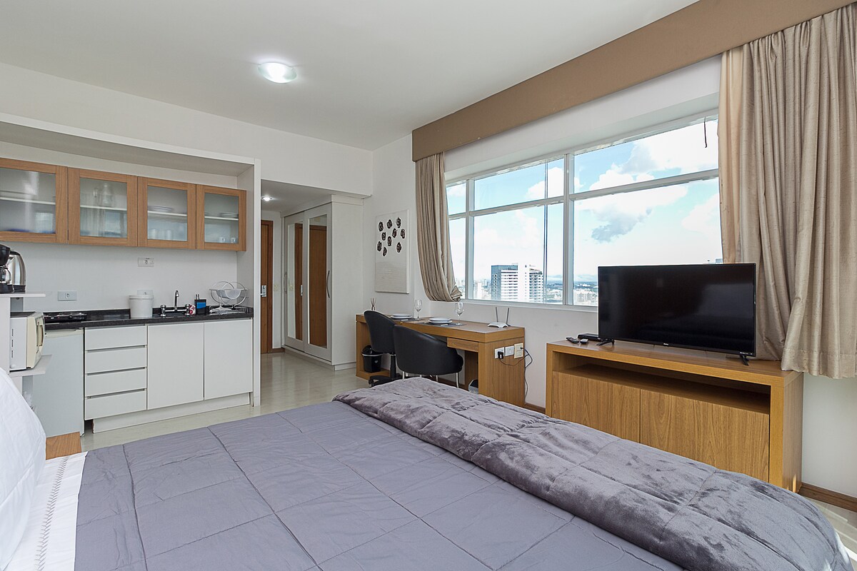 Nuovo e confortevole monolocale nel cuore della città. Reception 24 ore su 24, caffè/ristorante, coworking, palestra, lavanderia e noleggio biciclette - tutto all'interno del condominio. Posizione ideale per il turismo e gli affari. Facile accesso alla stazione degli autobus e all'aeroporto, linea di autobus turistici, vicino all'iconica Rua XV, centri commerciali, teatro Guaíra, Università Federale, oltre alla vicinanza allo stadio Couto Pereira e alla Pedreira Paulo Leminski/Ópera de Arame, che ospitano grandi spettacoli.
