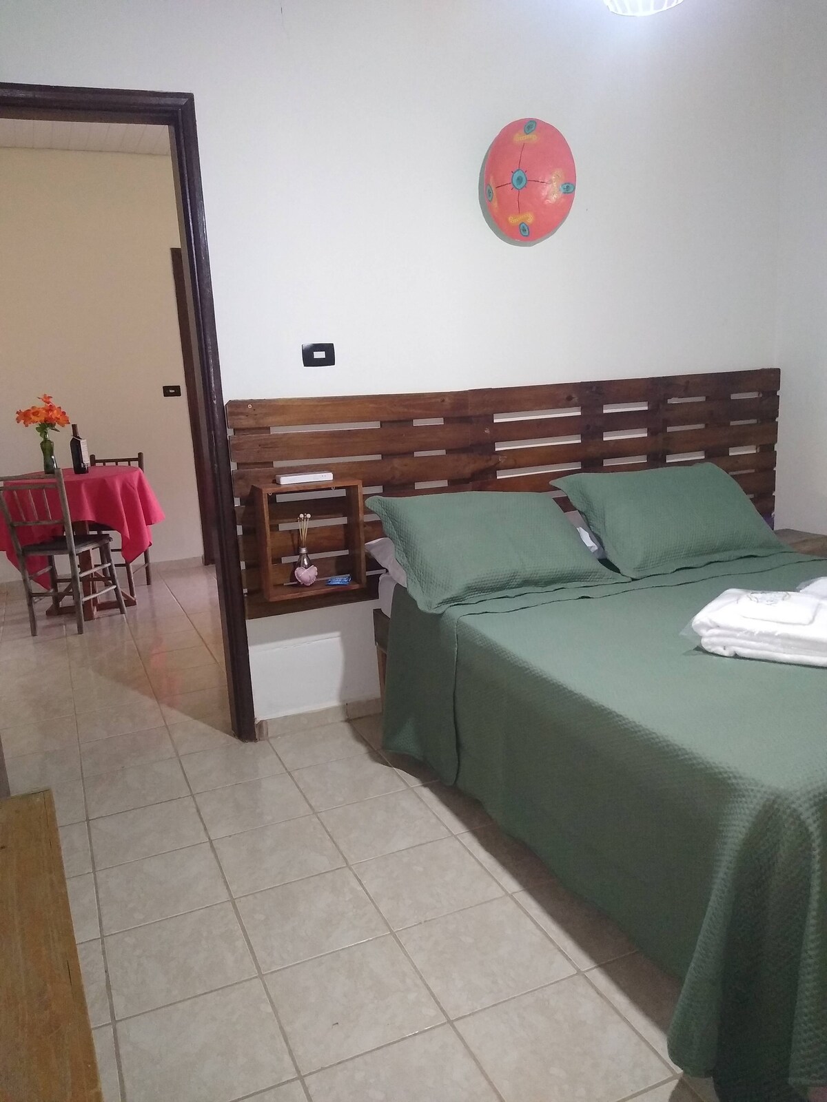 espaço exclusivo com dois ambientes, sendo uma suíte e uma cozinha funcional. com roupa de cama , banho e amenidades. ✓geladeira ✓microondas ✓sanduicheira ✓cafeteira elétrica. ✓copos, taças, xícara, pratos e talheres ✓sal, açúcar e sal grosso, café torrado e moído. ✓panela de arroz elétrica ✓churrasqueira e pia e mesa na área externa - produtos de limpeza. obs: não tem fogão, trazer somente alimentos prontos pra uso nos utensílios elétrico ou churrasqueira disponíveis