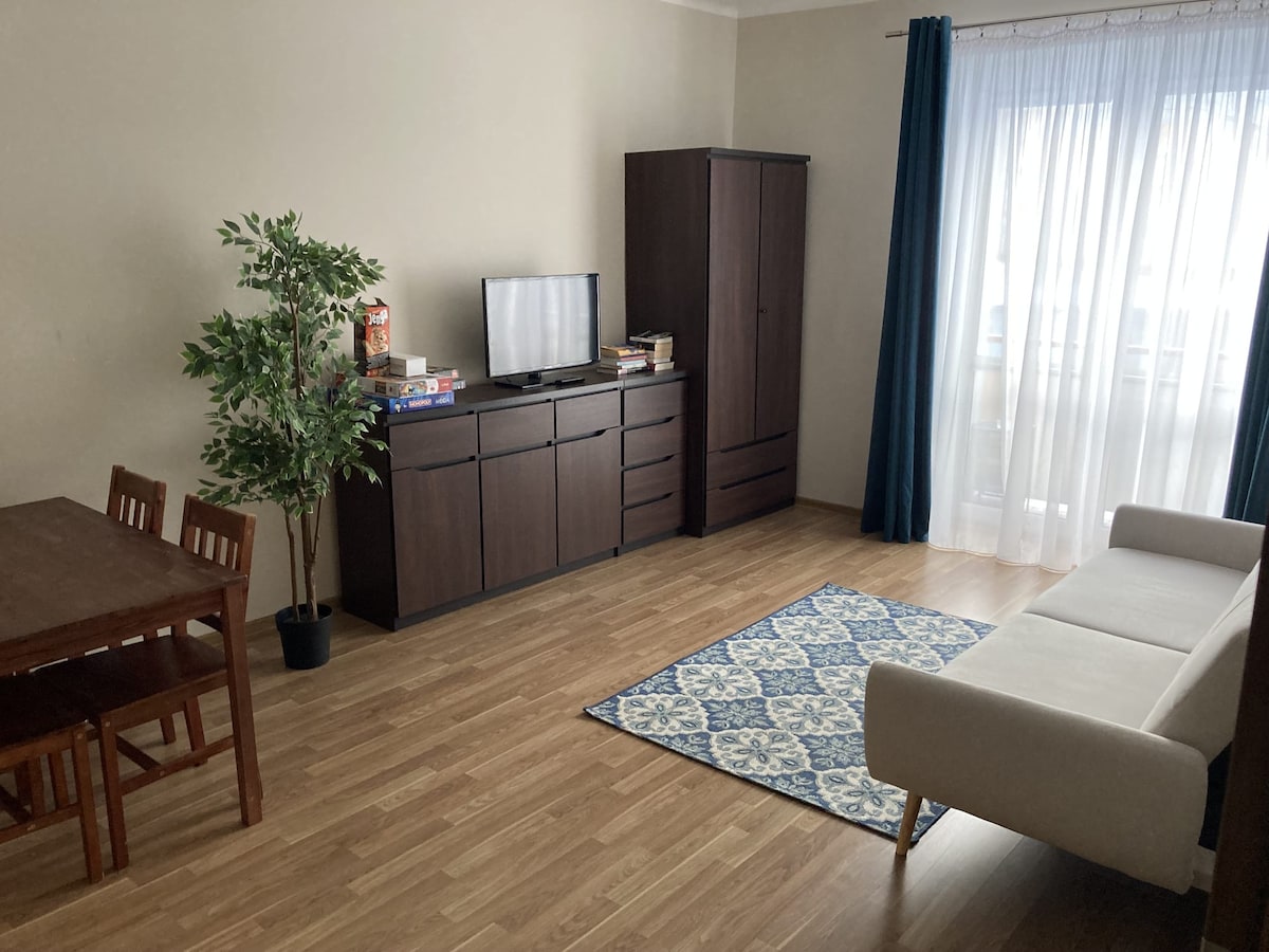 Un grande appartamento situato in pieno centro ma in una zona più tranquilla con due camere da letto matrimoniali (in ogni letto 200x160), un ampio soggiorno con angolo letto, una smart TV da 55 pollici con WIFI + TV e un balcone con vista sullo skyline della città e su Jasna Góra. Un bagno con vasca o doccia, con asciugamani e asciugatrice. Cucina completamente attrezzata (grande frigorifero, piano cottura con forno, lavastoviglie, bollitore, brocca d'acqua, tostapane, stoviglie, tutti gli utensili da cucina).