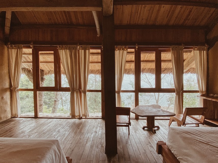 La stanza in legno si trova sul lato sinistro della casa di famiglia della signora Tien, offrendo sia privacy che vicinanza alla famiglia ospitante. La camera è progettata con materiali in legno e un tradizionale tetto a foglie di palma, con un letto al primo piano e un letto a soppalco, adatto per una piccola famiglia di quattro persone o una coppia. All'esterno della stanza c'è un ampio cortile che si affaccia sul giardino con un tavolino da tè, che offre uno spazio tranquillo a tutta la famiglia per godersi l'aria mattutina e la luce del sole.
