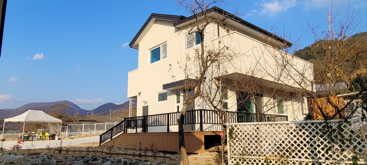 [독채] 탁 트인 전망, 농촌마을을 조망하는 전망, 노을이 아름다운 전원주택입니다. - 건축연면적은 총128미터제곱, 약 37평이며, - 2025년 8월에 완공한 신축으로, 2층엔 Sun Room이 있습니다. - 시골마을 전망을 보면서 바베큐를 먹을수 있습니다. - 노을을 자주 볼수 있습니다. - 왜관IC에서 10분거리에 위치해, 교통이 매우 편리합니다. - 시골답지 않게, 5분이내에 골프장이 3개나 있어 식당, 카페들도 많습니다. - 강태공들에게도 인기있는 매원저수지가 가까이 있습니다. - 근처의 대형 수영장(아이리스클럽)은 아이들의 핫플레이스 입니다.