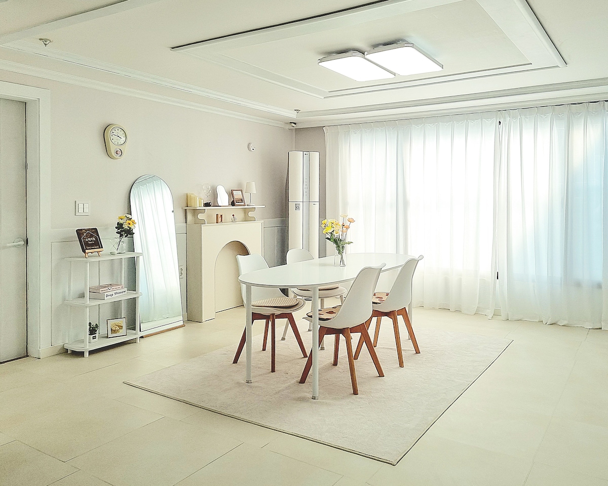 Rilassati in un quartiere tranquillo e confortevole, < Jung BNB > Vogliamo che tutti i ricordi del tuo viaggio siano belli. Crea ricordi indimenticabili nella città di Daejeon 💗 ✨ Posizione -15 minuti a piedi dalla stazione di Yongmun - Lotte Department Store (Seongsimdang) 20 minuti a piedi -15 minuti in auto da Bank-dong Umyeongjeong Street - Hanwha Life Ball Park a 20 minuti in auto 🚗 parcheggio - Al primo piano della proprietà possono essere parcheggiate fino a 2 auto Cosa aspettarsi all'interno dell'🏠alloggio 🏠 1 ️⃣ Camera da letto (2) - 1 letto matrimoniale (+ Standby Me) - 2 letti singoli ️2 ‼ Bagno (2) - Shampoo, trattamento, bagnoschiuma - Detergente in schiuma, spazzolino da denti, dentifricio -Towel - Asciugatrice, piastra per capelli 3 ️⃣ Soggiorno - Smart TV da 65 pollici - Netflix/YouTube Premium - Tavoli e divano per 6 persone 4 ️⃣ Cucina - Frigorifero, piano cottura, forno a microonde, bollitore elettrico, depuratore d'acqua - Utensili da cucina e stoviglie 🎁 da < JungBNB > - Varietà di giochi da tavolo - Multi-tap, caricabatterie per cellulare - Cereali, latte forniti - C'è anche una macchina da caffè a capsule. ☕️