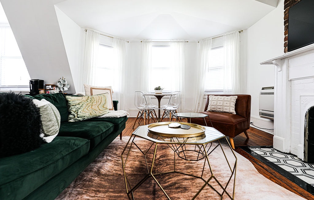 Kick back on the green velvet couch around the statement fireplace with exposed brickwork in this bright condo. It’s perched on the third story of a Victorian house dating from 1891. During the day, the condo is flooded with light from high ceilings and bay windows. The blackout curtains and plush king bed will help you sleep-in in the morning! SVR-00716
