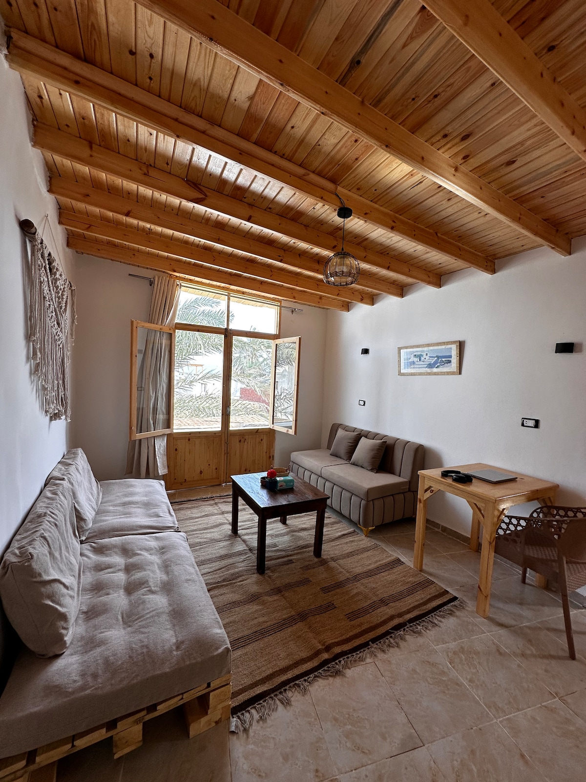 Tucked away in a quiet local neighborhood, this hidden Dahab gem offers comfort and privacy with a true sense of retreat, while still being only an 8-minute walk from the lively Lighthouse area and the beach. Wake to the sound of roosters and enjoy your morning coffee in the garden. At sunset, head up to the rooftop for sweeping views of Sinai’s changing colors, then end the evening around the peaceful garden fire under a sky full of stars, with the city glowing in the distance.