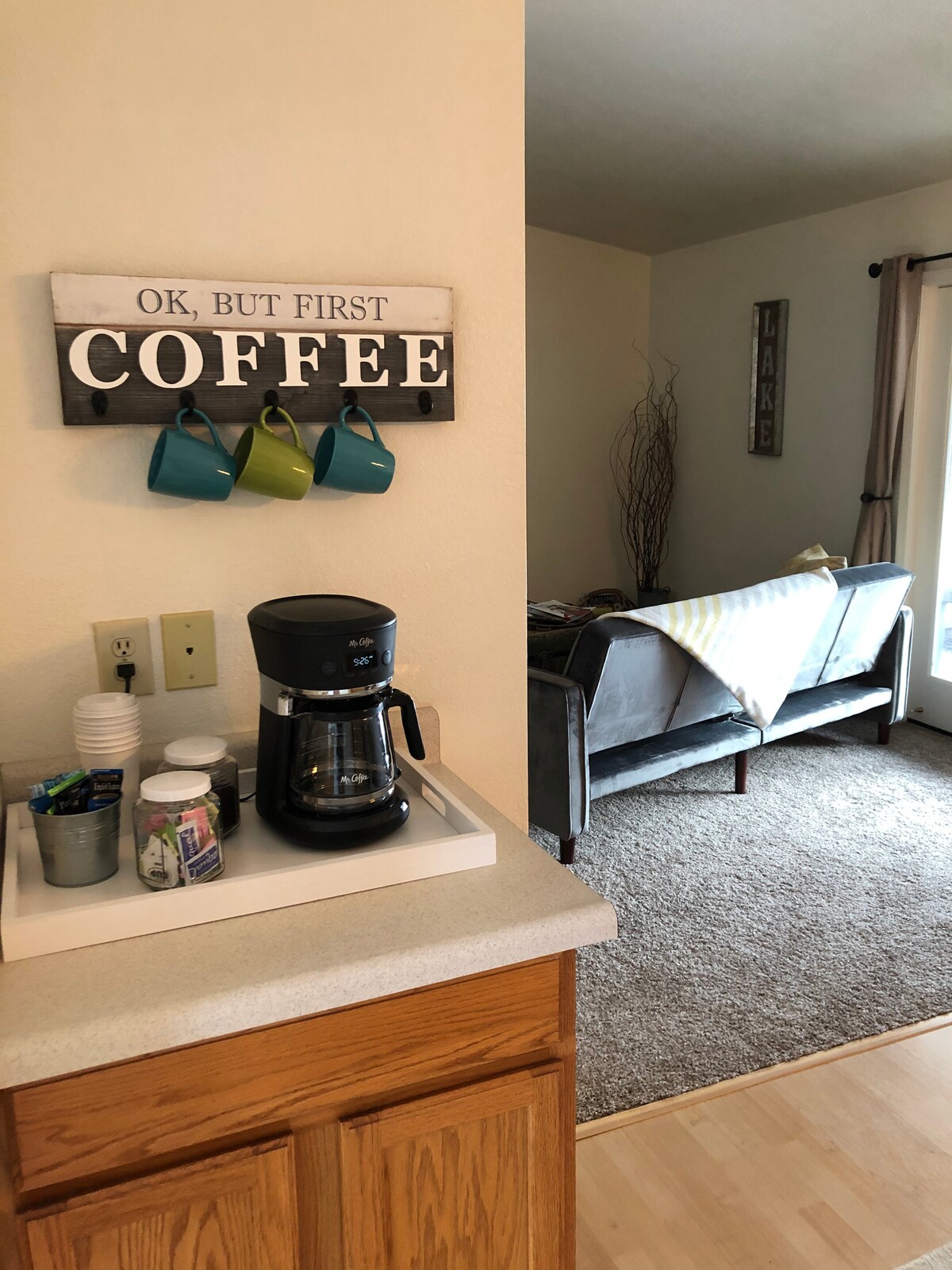 Il nostro alloggio è stato descritto come una casa lontano da casa, con una cucina completamente attrezzata e un angolo caffè. Questa cucina fa al caso vostro se vi piace cucinare e risparmiare sulle spese per il cibo Offriamo un fantastico Coffee Bar con cialde e caffè macinato. Sistema Keurig (caffettiera e cialde), caffettiera a stantuffo. Vari tipi di tè, cioccolata calda, sidro di mele, panna liquida e altro ancora *Macchina per waffle, miscela e condimenti *Snack *Lavatrice e asciugatrice *Barbecue e panchina da picnic sul patio *Altalena * Caricabatterie per veicoli elettrici Livello 2 *Cortile/cancello recintato