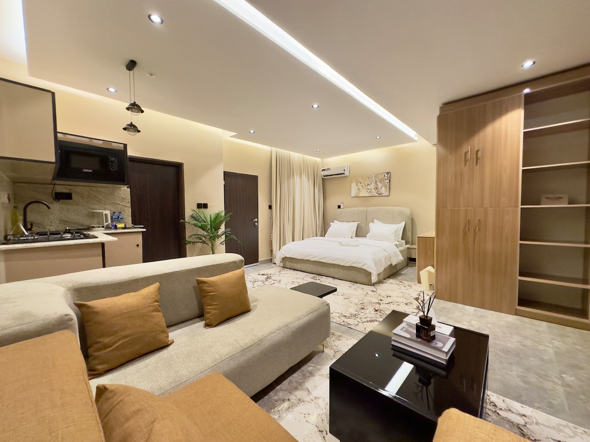 Sfuggi al trambusto della città in questo accogliente ed elegante monolocale. L'estetica contemporanea di questo spazio è perfetta per le coppie o per chi viaggia da solo. È completamente arredato e si trova in una tenuta sicura. Lo spazio è dotato di wifi gratuito superveloce e ampio parcheggio. La cucina è dotata di attrezzature moderne per la tua comodità. Con elettricità 24 ore su 24, 7 giorni su 7, la nostra smart TV e altri servizi di lusso, questa è una casa lontano da casa, con i comfort di una suite d'albergo da sogno.