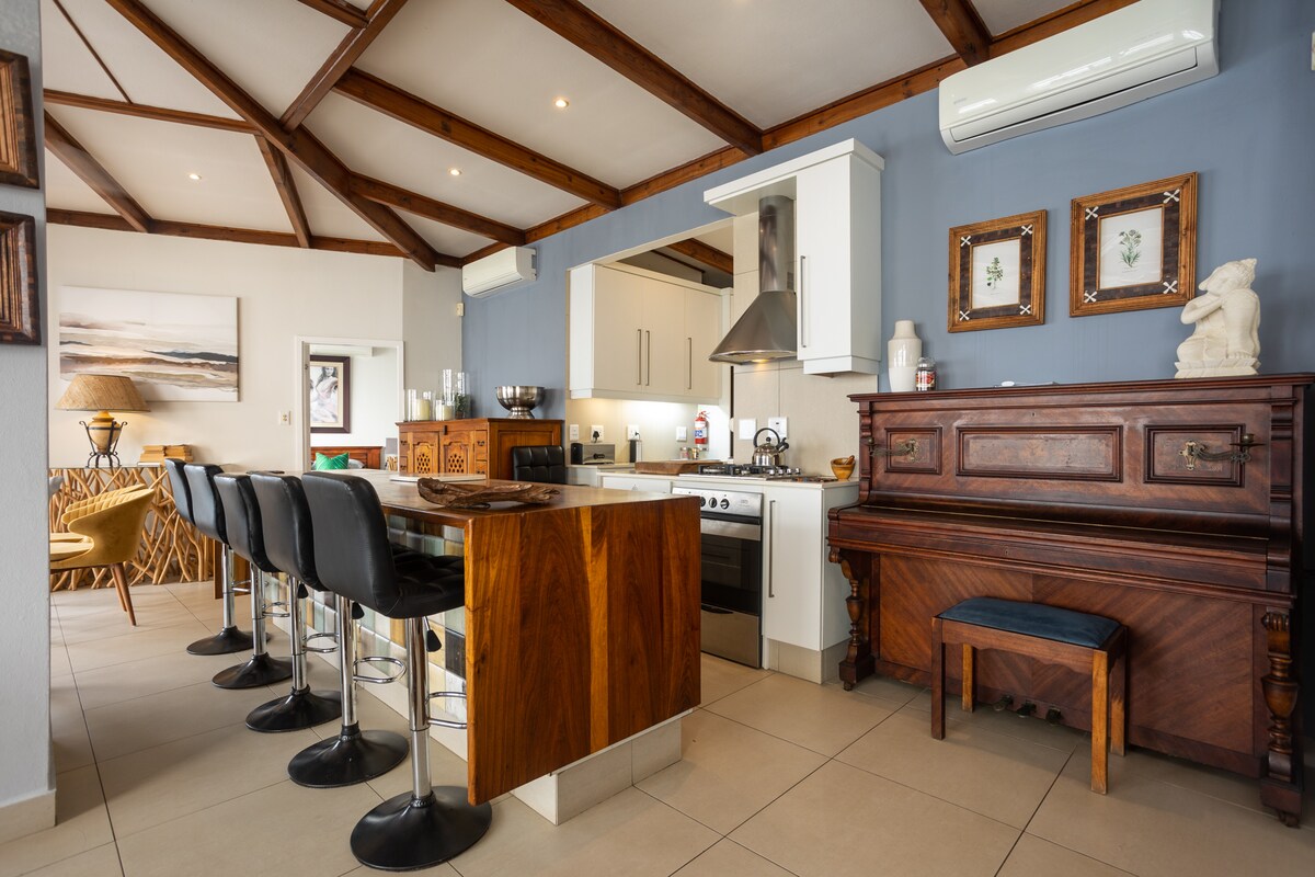 Un grazioso cottage con tetto di paglia e due camere da letto, immerso in un tranquillo giardino di 6.000 metri quadrati a Salt Rock. Splendidamente arredato, con una cucina moderna completamente attrezzata. Forno SMEG, lavatrice/asciugatrice, lavastoviglie e frigorifero/congelatore. Uscendo dal salotto si accede a un incantevole patio, situato sui gradini di una grande piscina. A soli 2 km dalla spiaggia e molto vicino a Sage, Litchi Orchard, al centro commerciale Tiffany's e alla nuova Salt Rock City. I bambini adorano correre nell'ampio giardino e, naturalmente, in piscina.