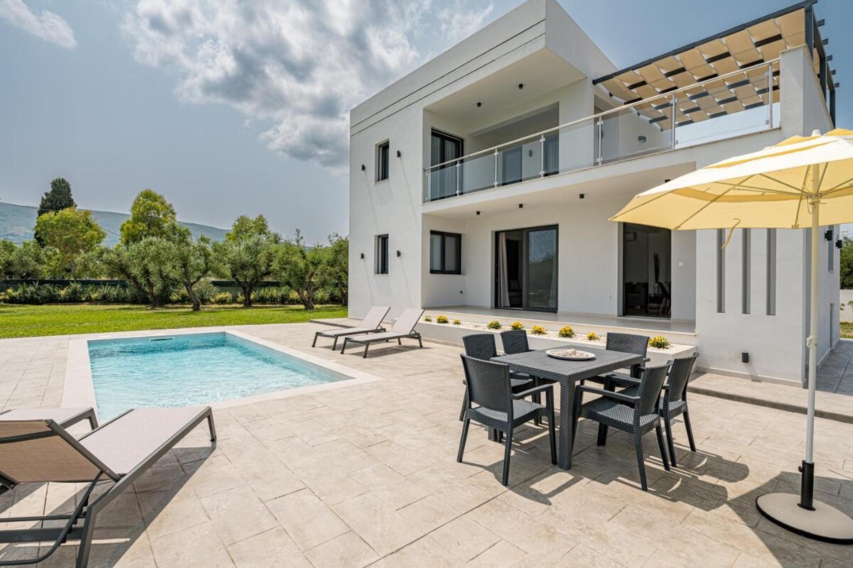 Newly built spectacular villa. Spacious, uncluttered simplicity, contemporary designed villa in a chosen for stress-free location that sits amongst olive trees . Zenith White Elegant Villas embraces minimal grace in a modern structure to accommodate up to 6 people in 117m2, made of pale white spacious interiors that are matched by a generous terrace, furnished with outdoor furniture and a sparkling private swimming pool, encouraging guests to enjoy outdoor living.
