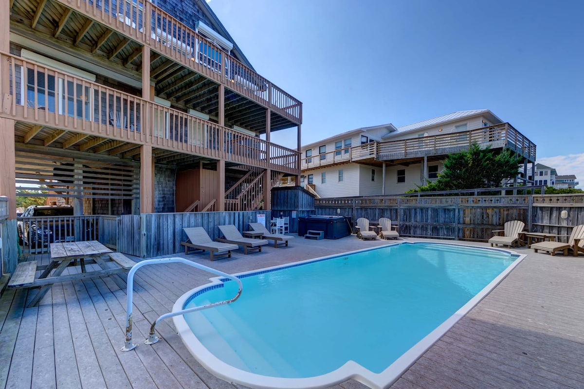 Questa spaziosa casa con 5 camere da letto e 4 bagni e mezzo si trova a solo un isolato dalla spiaggia e offre una vista mozzafiato sull'oceano! Questa casa può ospitare più famiglie, con bagni interni in 3 delle camere da letto, una camera con letti a castello, un soggiorno secondario e un angolo cottura. Benvenuto nella perfetta fuga delle Outer Banks, a pochi passi da due accessi alla spiaggia, con doccia esterna, tanto spazio sul ponte per ammirare l'alba o semplicemente rannicchiarsi con un buon libro e una vasca idromassaggio privata per rilassarsi dopo una giornata al sole.