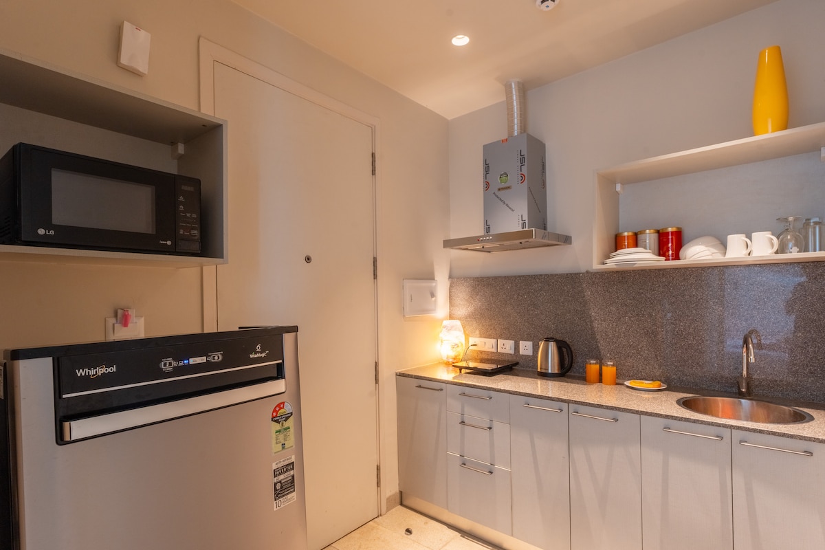 Entra in un mondo di raffinato fascino contemporaneo. Questo appartamento di 525 piedi quadrati dal design curato offre un mix perfetto di stile e funzionalità, perfetto sia per i viaggiatori che per i professionisti che desiderano soggiornare in un alloggio vicino all'aeroporto. Posizione e accessibilità: 1. Aeroporto IGI: 25 minuti (circa 19 km). 2. Yashobhoomi Convention Centre: 20 minuti(circa 12 km). 3. Stazione della metropolitana Dwarka Sector 21: 15 minuti (circa 9 km). 4. Stazione ferroviaria di Gurgaon: 20 minuti in auto (circa 12 km).