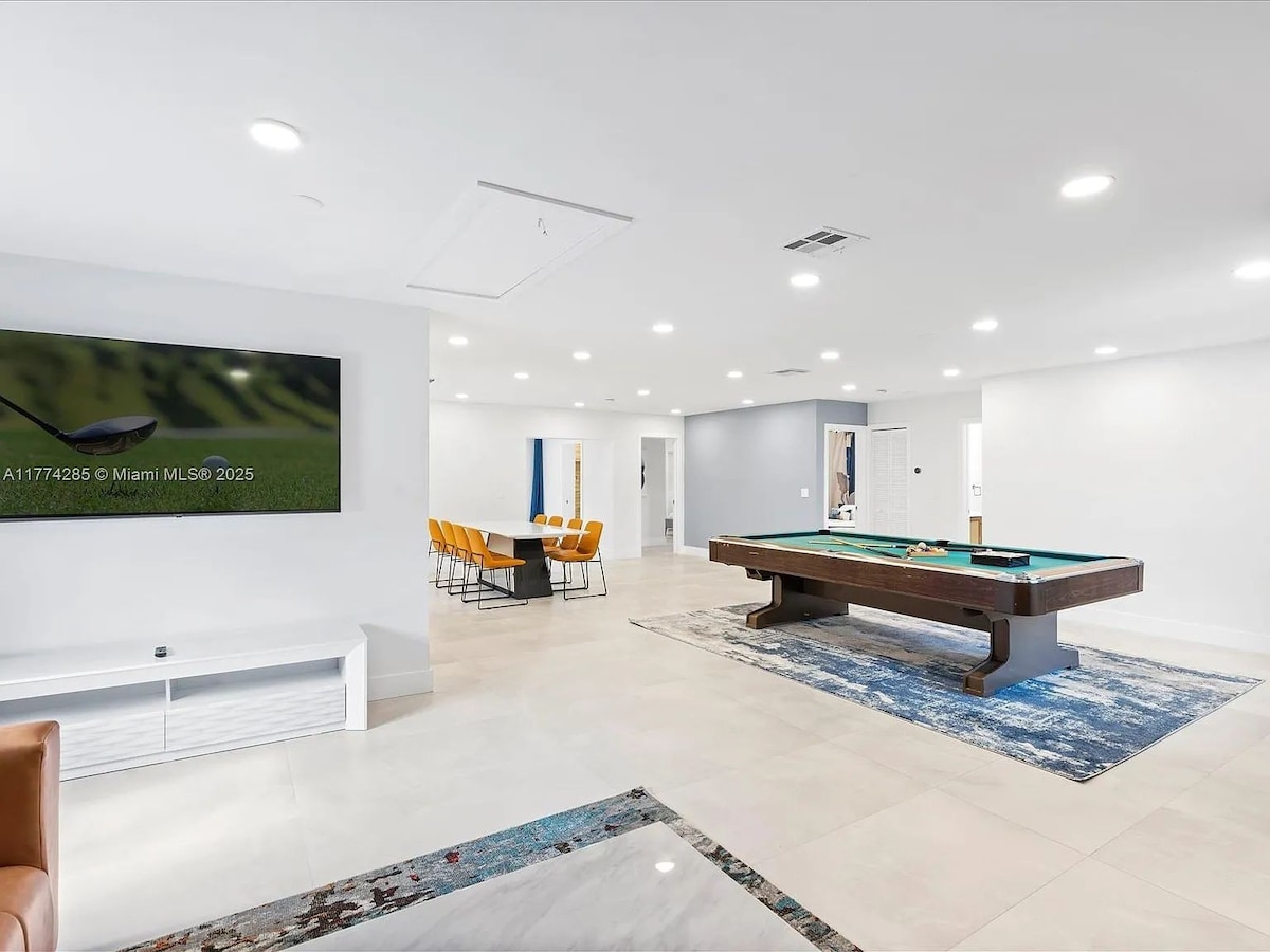 Villa ristrutturata con 4 camere da letto vicino a Hallandale Beach con nuova piscina, vasca idromassaggio e cortile recintato. 3 camere hanno letti queen size e la 4a funge da sala cinema/giochi con tavolo da biliardino e divano letto. La cabana coperta include ventilatori, divano, TV, camino, barbecue, lettini e vasca idromassaggio. All'interno: cucina completa, camino interno, area di lavoro, Wi-Fi e streaming. Parcheggio in loco, lavanderia e animali domestici a pagamento. Vicino all'Aventura Mall, al Gulfstream Park, all'Hard Rock Casino e all'Hollywood Beach Boardwalk.