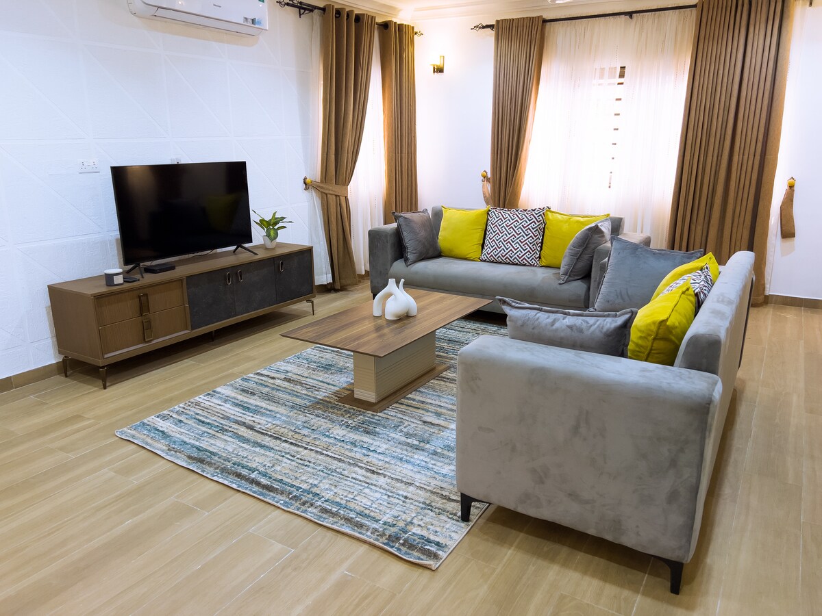 Rilassati in questo tranquillo ed elegante appartamento con una camera da letto, una cucina a pianta aperta e una zona giorno. Offre tutto il necessario per un soggiorno confortevole, offrendo una fuga tranquilla dal centro di Accra. A soli tre minuti di auto dal City-Escape Hotel e a cinque minuti dalla spiaggia di Prampram, è perfetto per lavorare a distanza o per una vacanza con il tuo partner o gli amici. Questo spazioso appartamento indipendente è completamente arredato con elettrodomestici e servizi di ultima generazione.