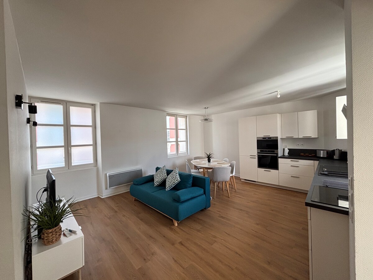 ✨ Benvenuti nel cuore di Dax! Soggiornate in questo elegante appartamento che unisce comfort, modernità e stile, situato in posizione ideale nel pieno centro della città. Tutto è raggiungibile a piedi: negozi, terme, ristoranti e luoghi imperdibili di Dax. Tutto è stato pensato per farvi sentire come a casa vostra, per un soggiorno rilassante, professionale o termale. 🕊️ Un luogo perfetto per rigenerarsi e godersi appieno Dax.