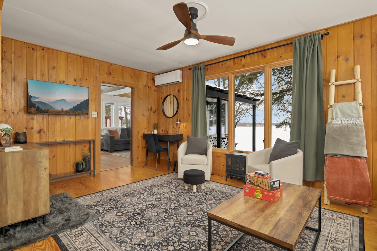 Rilassati con tutta la famiglia in questo chalet fronte lago. Siediti sul ponte per ascoltare i merli e goderti la "migliore vista sul lago", secondo i vicini. Tutti i mobili e gli elettrodomestici nuovi ti faranno sentire a tuo agio. Accendi il caminetto a gas se hai bisogno di riscaldarti, o semplicemente per creare un po' di atmosfera mentre ti rilassi sul divano per guardare un film. Le due camere sono dotate di letti e lenzuola nuovi. Il divano si apre su un comodo letto per avere più spazio personale, se necessario.