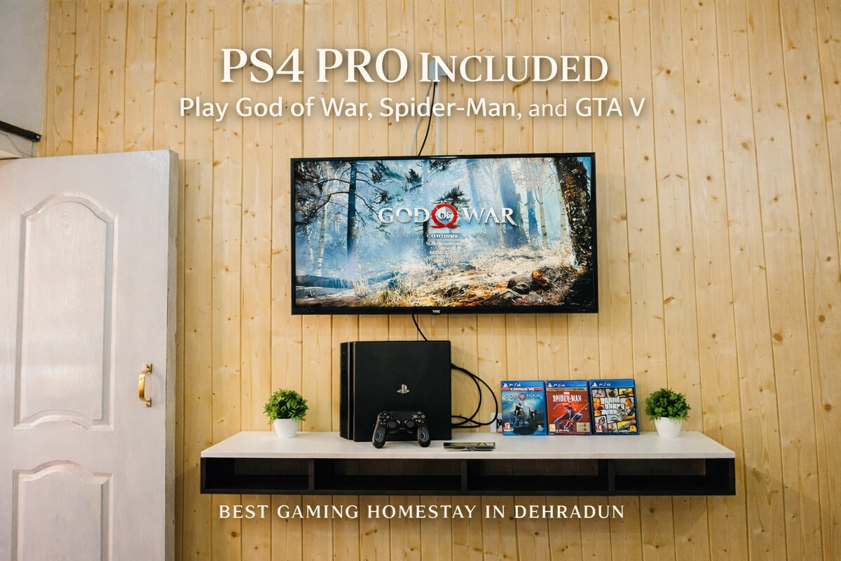 Enjoy a stylish and private homestay in Dehradun, perfect for families and groups of 4–6 guests. The stay features a PS4 Pro gaming setup with popular games like God of War, Spider-Man, and GTA V, along with fast high-speed Wi-Fi for work and streaming. You get a spacious hall, private kitchen, small dining area, private bathroom, washing machine, and a comfortable main bedroom. Ideal for relaxing, working, and having fun. ⸻