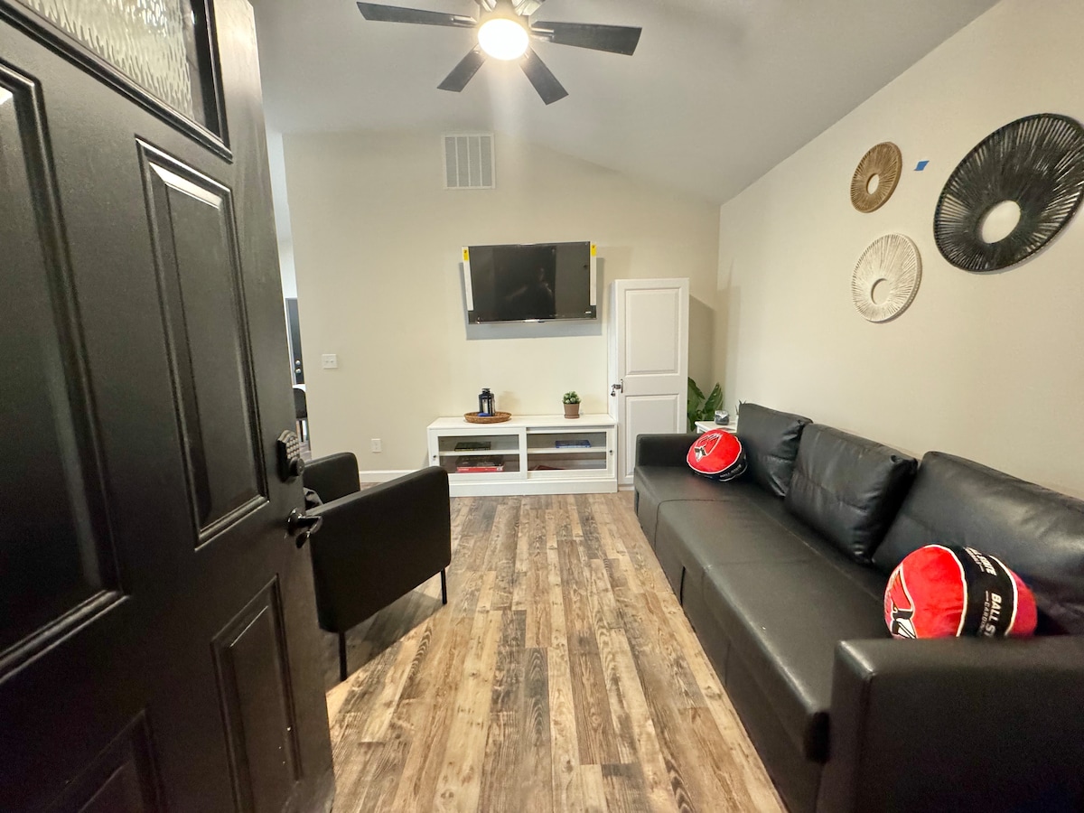 Ti diamo il benvenuto nel tuo incantevole rifugio vicino alla Ball State University. Questa nuovissima casa indipendente con 1 camera da letto e 1 bagno dispone di un accogliente soggiorno, cucina completamente attrezzata con elettrodomestici in acciaio inossidabile e piani di lavoro in quarzo, una spaziosa camera da letto con letto queen-size. Goditi l'ampio bagno e la comodità di una lavatrice e asciugatrice in casa. Con parcheggio privato e la possibilità di ospitare fino a 4 persone (divano letto per 2 persone). Questa oasi è perfetta per chiunque. Prenota il tuo soggiorno e crea ricordi indimenticabili