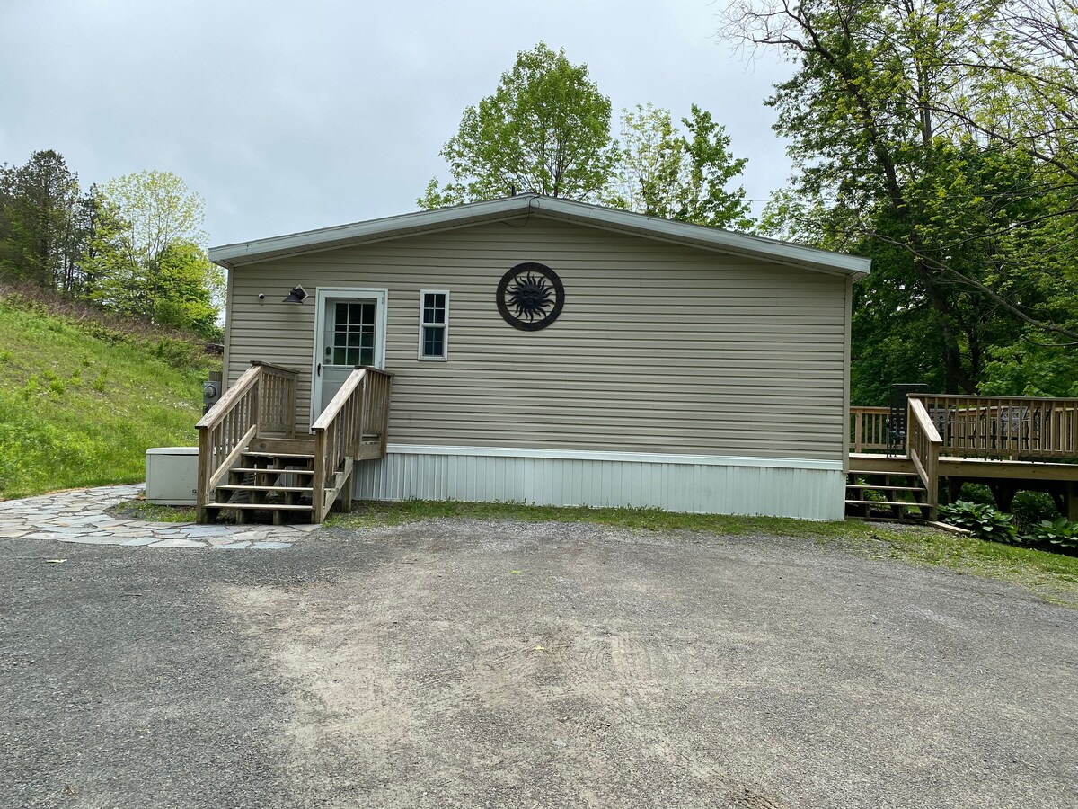 Il Mountain Mews, un edificio di 100 anni a un piano, a basso consumo energetico e accessibile ai disabili, si trova in un complesso familiare nel cuore del Catskill Park, vicino al Belleayre Ski Center. Vivi la natura incontaminata in un ambiente privato unico. Rallenta con i giochi da tavolo nella grande sala o con il barbecue all'aperto sul patio in pietra, che offre una vista incantevole. Un grande tavolo da fattoria con posti a sedere per 8 persone, una cucina moderna e una camera con letti a castello pensati per i bambini ti aspettano! Stacca la spina per almeno una settimana. Ricarica EV di livello 2 da 19 kW 80 A a 0,20 USD/kWh