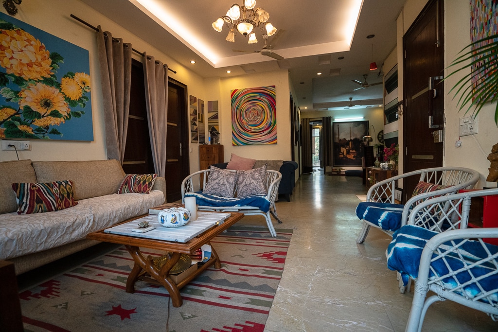 Rilassati e ricaricati in quest'oasi di pace ed eleganza, progettata per la vita moderna: l'appartamento è uno dei luoghi più tranquilli di Nuova Delhi. Situato in posizione centrale a Greater Kailash 1 (sud di Delhi), la località è ideale per chi visita Delhi per una pausa o prevede di lavorare da casa: siamo una coppia organizzata che ama ospitare. Lo spazio ha un proprio ingresso e una cucina con una grande smart TV e una scrivania da lavoro; la velocità della connessione internet è superiore a 50 mbps, con una Ro e un giardino nelle aree comuni