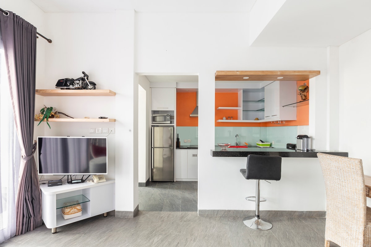 Questo appartamento privato con 1 camera da letto dispone di un comodo soggiorno chiuso con amaca, divano e cucina completamente attrezzata. Dispone di un bagno moderno e di un'ampia camera con aria condizionata, un letto matrimoniale grande, un tavolo da pranzo, una smart TV e una scrivania (90 Mbps). Questo appartamento è stato completamente ristrutturato (2024) e fa parte di un complesso con parcheggio privato. Si trova in una posizione incredibile, un'oasi confortevole nel centro di Canggu e in una vivace strada a pochi passi da molti ristoranti e dalla spiaggia di Old Mans (700 mtr).