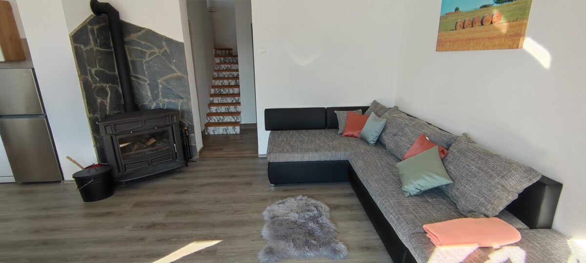 Questa moderna casa in legno con due appartamenti separati è la scelta perfetta per chi viaggia in coppia e desidera una sistemazione tranquilla a contatto con la natura. La casa si trova a 5 minuti di auto dal Parco nazionale dei laghi di Plitvice. La casa è composta da due appartamenti separati, ciascuno con ingresso indipendente e terrazza separata. L'appartamento dispone di un piano terra e di una camera da letto al piano superiore.
