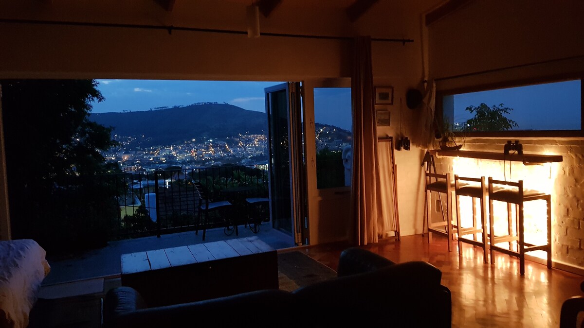 Sulle pendici della Montagna della Tavola si trova il nostro grande monolocale in stile boho, ☆ valutato 5 . MAGNIFICA vista sulla città, sulla baia, sulla montagna della Tavola, su Robben Island, su Lions Head e su Signal Hill (e, nelle giornate limpide, anche sulle Winelands e sul Parco Nazionale della Costa Occidentale). Molto privato, spazioso, luminoso e silenzioso. A 5 minuti in auto dalla città e a 10 minuti dalle migliori spiagge. A un isolato dalle passeggiate in montagna e dalle piste ciclabili. Sulla linea dell'autobus. Una casa molto amata.