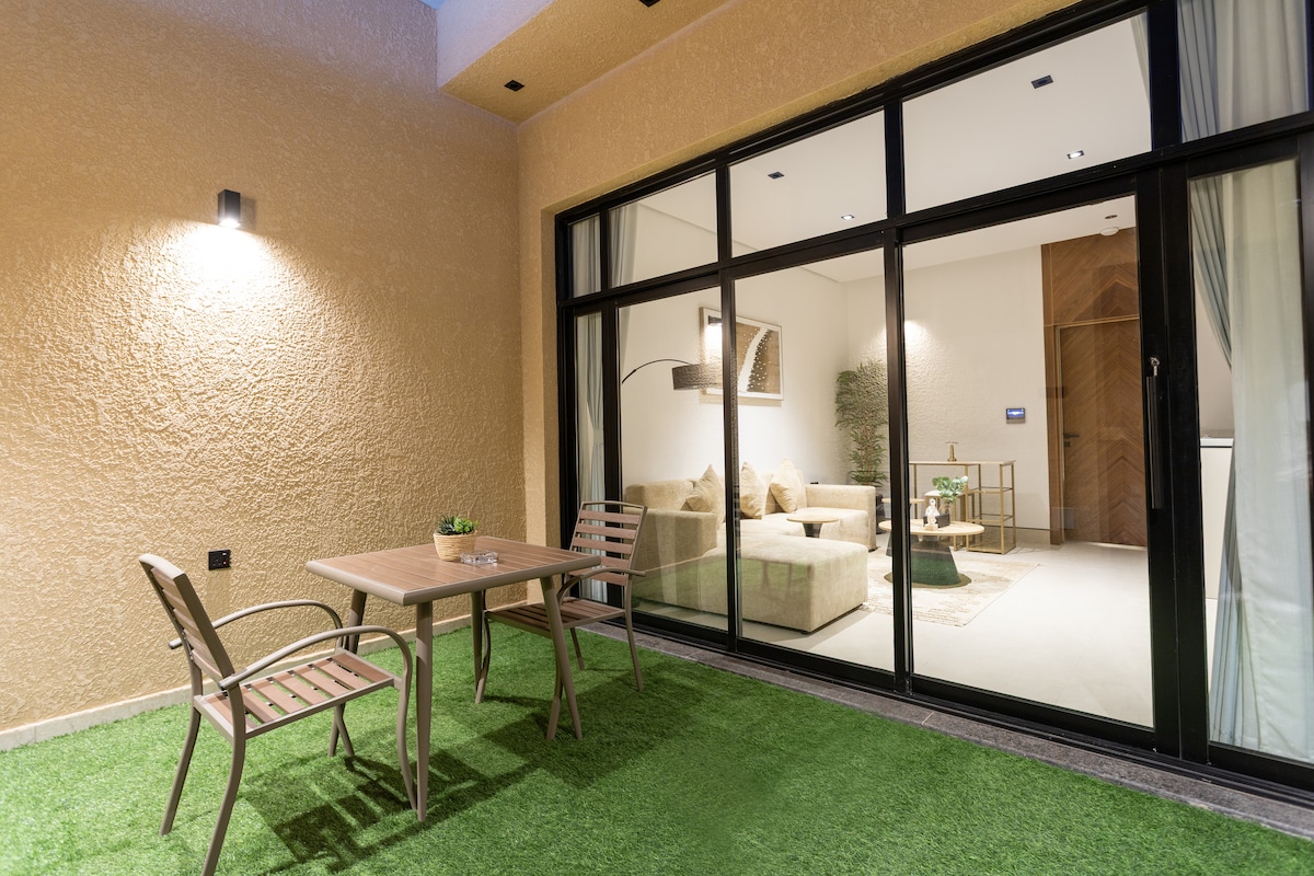 Vivi con stile in questa suite boho-chic con 1 camera da letto a Dhahrat Laban! Piano terra con atmosfera privata, illuminazione accogliente, mobili di design, Wi-Fi veloce, smart TV e cucina completa. Perfetto per professionisti o coppie che desiderano un soggiorno caldo e rilassante vicino a KSU e ai principali punti della città. L'atmosfera di un boutique hotel, a un prezzo accessibile.