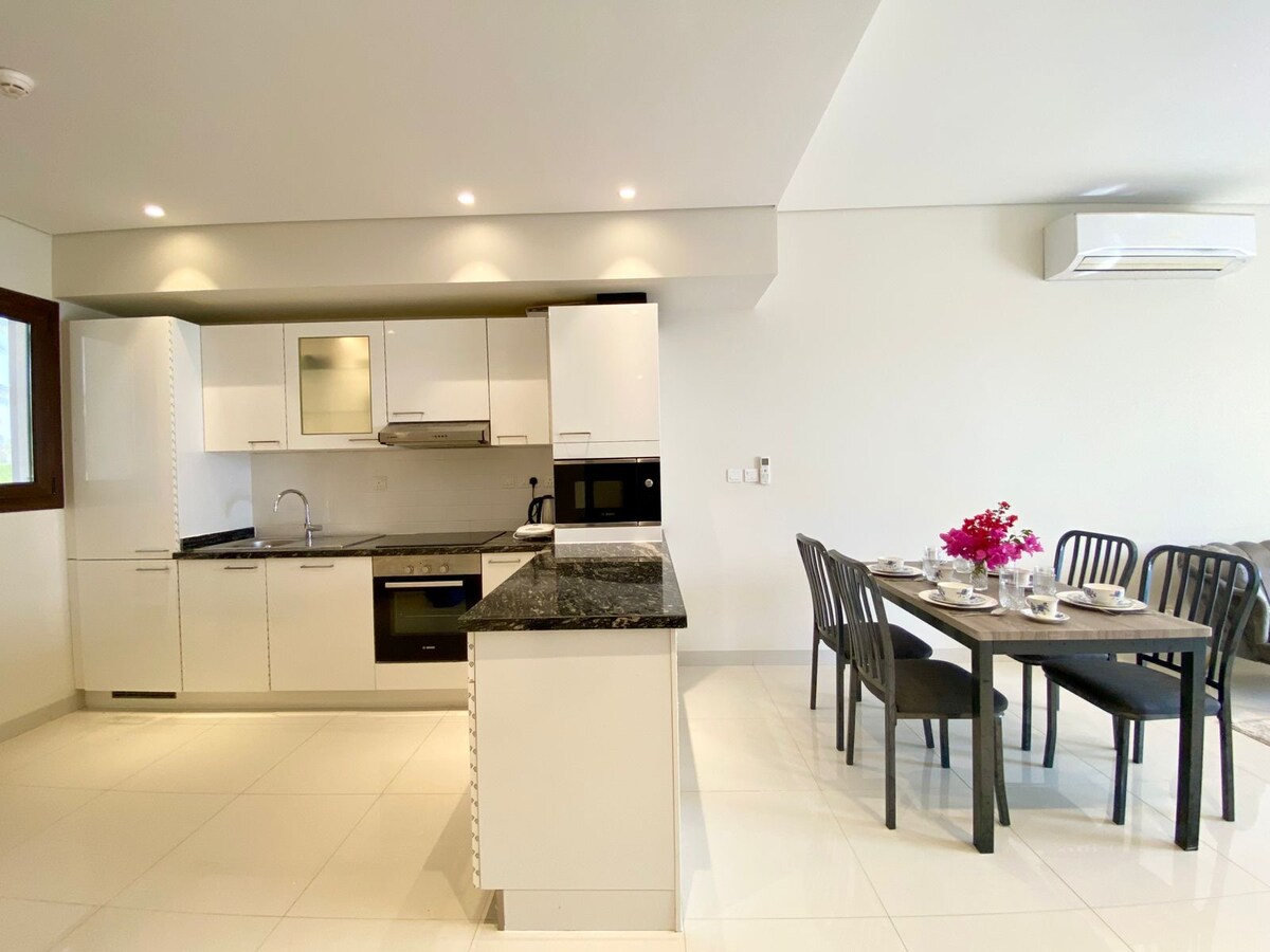 Goditi un soggiorno di lusso in questo moderno appartamento con 2 camere da letto, splendidamente ristrutturato, nel cuore di Hawana Salalah, ospitato professionalmente da un Superhost esperto. Luminosa, spaziosa e rifinita secondo uno standard eccezionale, offre splendide viste sull'acqua e sulle montagne da un balcone privato. A soli 5 minuti dal porto e a 10 minuti dalle spiagge private. Con piscina, campi da tennis e parco giochi, è ideale per famiglie, coppie o soggiorni più lunghi. Non limitarti a soggiornare a Salalah: vivila con stile.