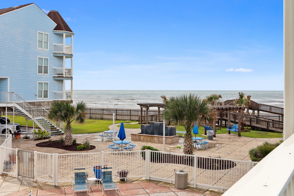 Recentemente ristrutturato, con un'accogliente atmosfera da cottage sulla spiaggia. Il mio appartamento è SULLA SPIAGGIA. Non attraversare la strada trafficata con la tua famiglia. Spazio per 6 persone. Letto regolabile a due piazze e divano letto a due piazze con 2 letti a castello. Nuova cucina, 2 TV a schermo piatto. Wifi gratuito e Netflix. Il complesso dispone di una grande piscina tropicale riscaldata con 3 vasche idromassaggio. Accesso privato alla piscina e alla spiaggia. La proprietà è recintata e sicura. Una cassaforte per riporre i tuoi oggetti di valore è gratuita per il tuo uso. A 10 minuti da Moody Gardens o Pleasure Pier. Rampe per disabili