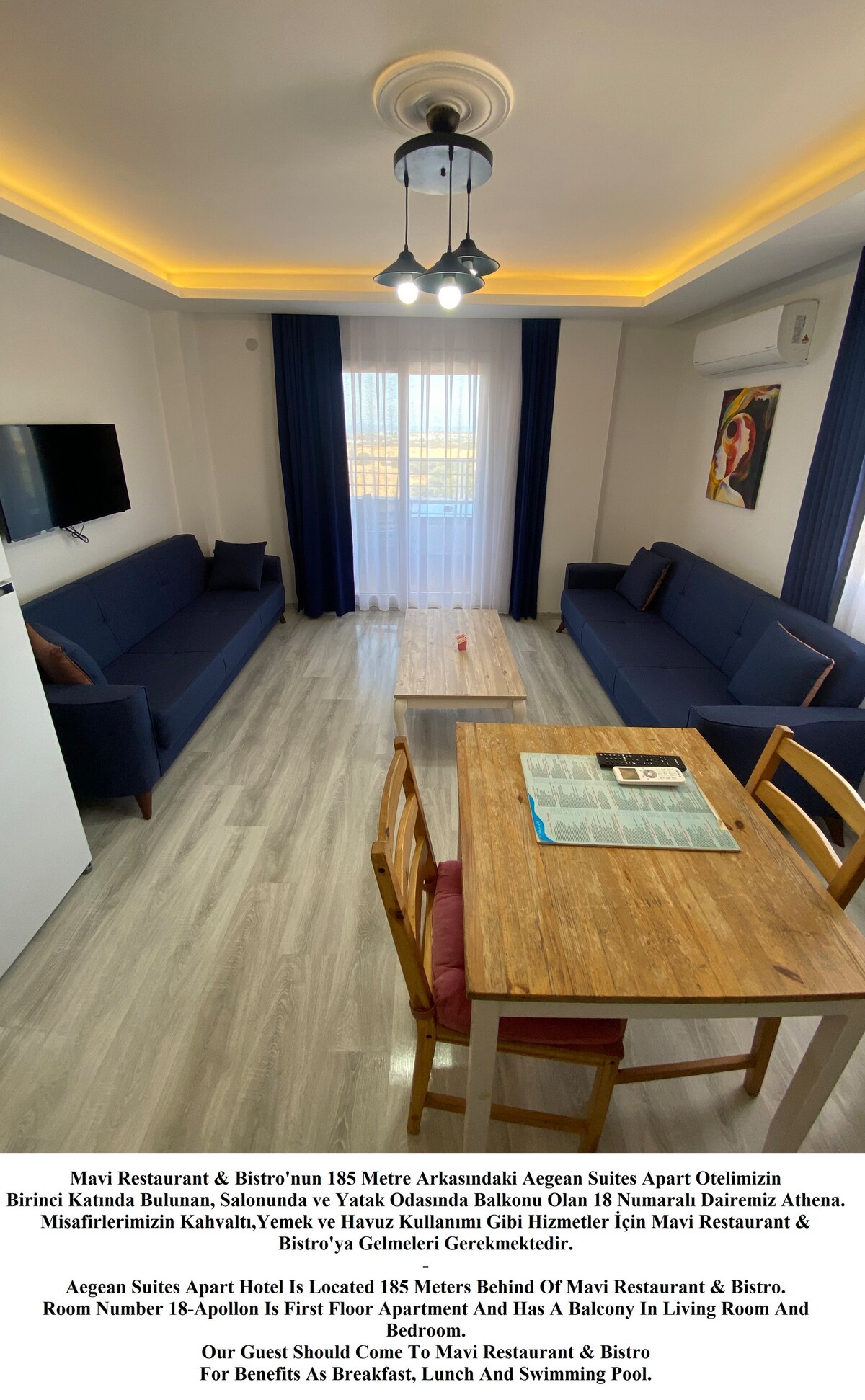 Il nostro Aegean Suites Apart Hotel dietro Blue Restaurant & Bistro a 185 metri Il nostro appartamento 17 con balcone nel salotto e camera da letto al primo piano è Apollo. Aegean Suites Apart Hotel is located 185 Meters Behind Of Mavi Restaurant & Bistro. Room Number 17-Apollon Is First Floor Apartment and Has a Balcony in Living Room and Bedroom.