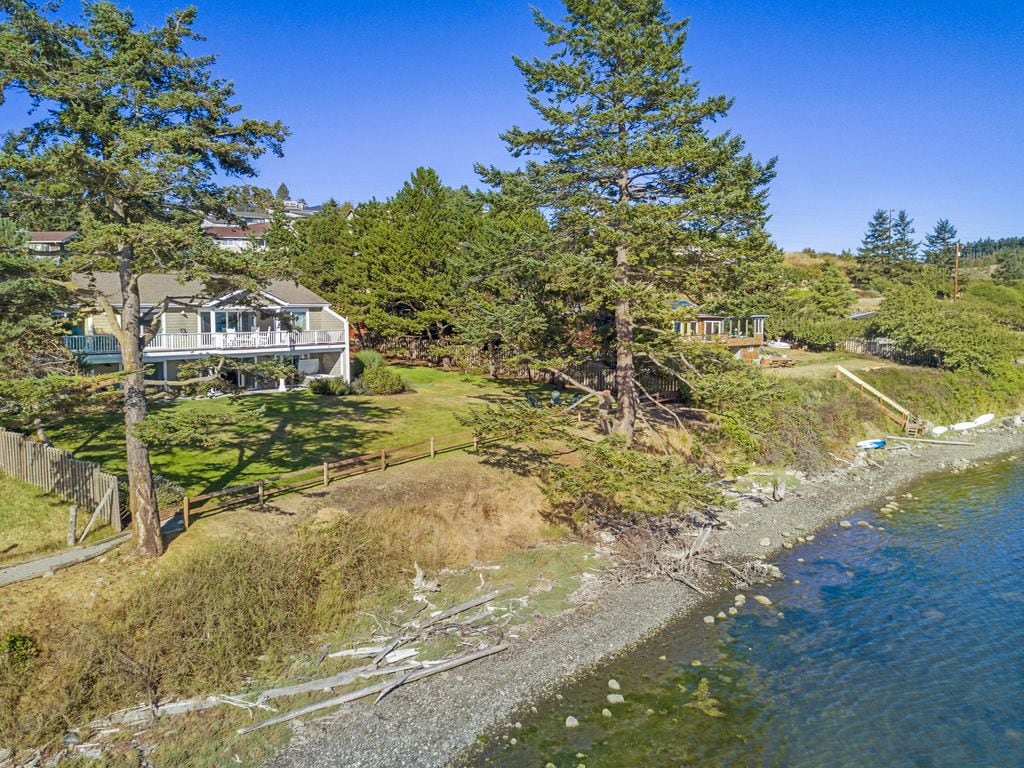 This two-bedroom cottage is just a mile from the town of Friday Harbor but offers a perfect way to get away from it all with a lush back yard that looks out over the bay with incredible views of Jackson Beach. At low tide you can step off the sea wall on the property and walk across to explore to your heart's content. When you're done with your day, the sound of gently running water outside will lull you to sleep Fiber internet connection allows your whole family to work or remote school.