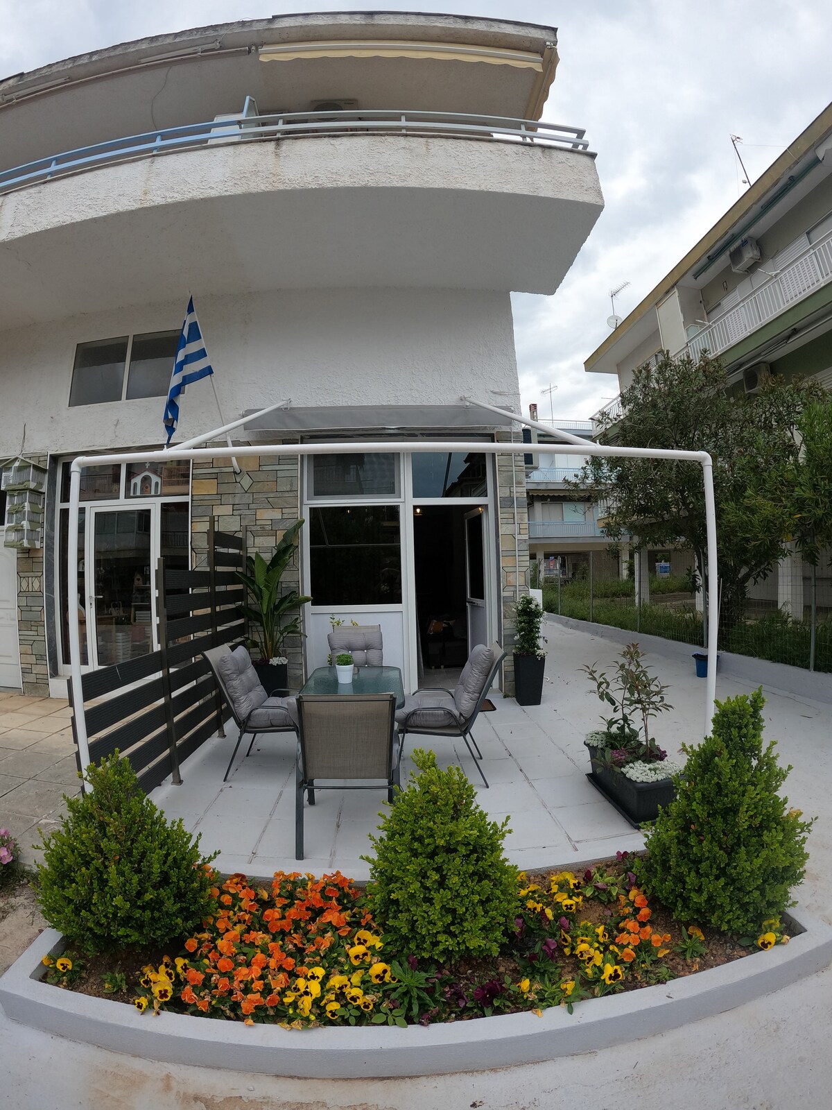 L'appartamento indipendente completamente attrezzato si trova a Nea Moudania , Chalkidikis , dista 250 metri dalla spiaggia e 800 metri dal centro città. L'appartamento è composto da una camera da letto con letto matrimoniale grande e un divano letto , un bagno e una cucina completamente attrezzata. Gli ospiti avranno accesso e vista sul fantastico giardino di 4 acri dove potranno godere di una delle numerose aree salotto. L'appartamento è ideale contro il covid19 per🦠 via del grande giardino e della pulizia !