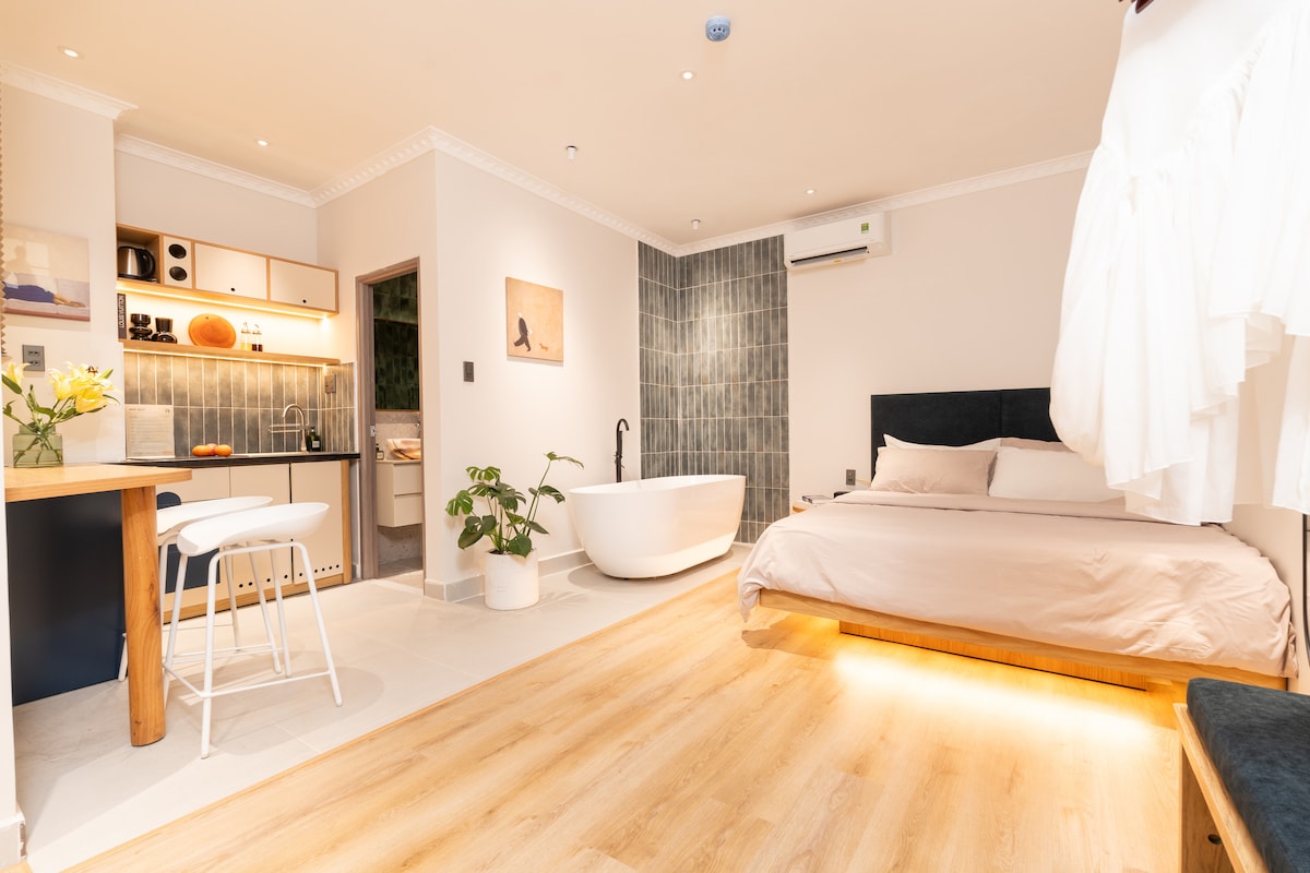 Scopri un gioiello nascosto nella nostra oasi, immersa nell'abbraccio della natura. Puoi davvero rilassarti e goderti momenti speciali mentre ti rinfreschi sotto il cielo aperto con la nostra doccia esterna o ti immergi in una lussuosa vasca da bagno. Ogni angolo è progettato con amore, rendendolo un rifugio ideale per le coppie che cercano un'esperienza indimenticabile e intima. A 15 minuti da Ben Thanh, un sacco di bancarelle di cibo di strada sparse nelle vicinanze, pur avendo un proiettore con Netflix Premium, Youtube. Rifugiati dal mondo con noi ♥