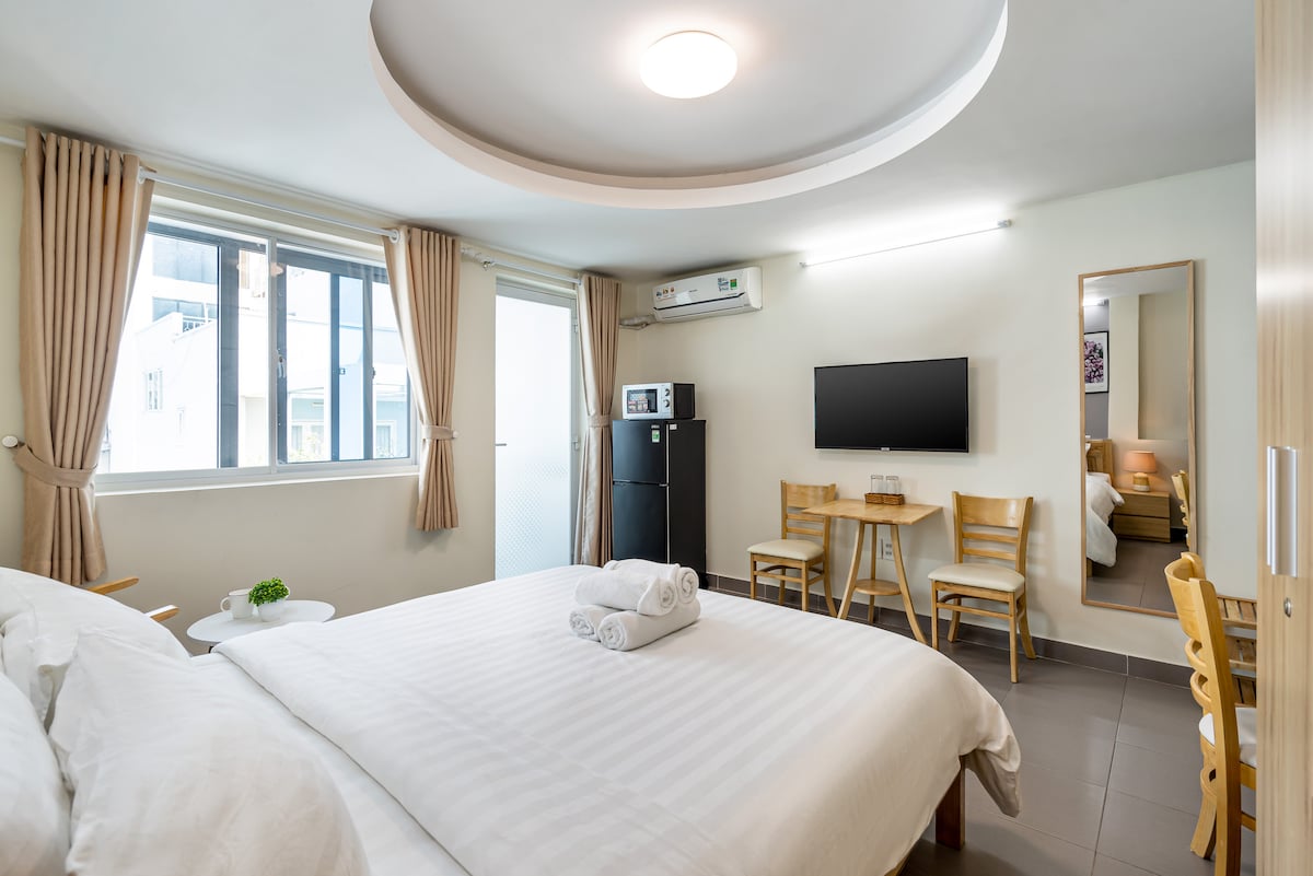 Goditi un'esperienza all'insegna dello stile in centro città! È spazioso, pulito e ha la luce naturale. La cucina e il bagno privati sono separati dalla zona notte. - 1 letto morbido per dormire bene - Balcone con bella vista sulla città - Ascensore, condizionatori, divano, armadio, tavolo da pranzo - Frigorifero, forno a microonde, cuoci-riso, piano cottura a induzione, bollitore e utensili da cucina - Smart TV con connessione wifi veloce - Pulizia GRATUITA, lavanderia e parcheggio - Accesso 24 ore su 24, 7 giorni su 7 e sicuro #Indirizzo: Nguyen Phi Khanh street, Distretto 1