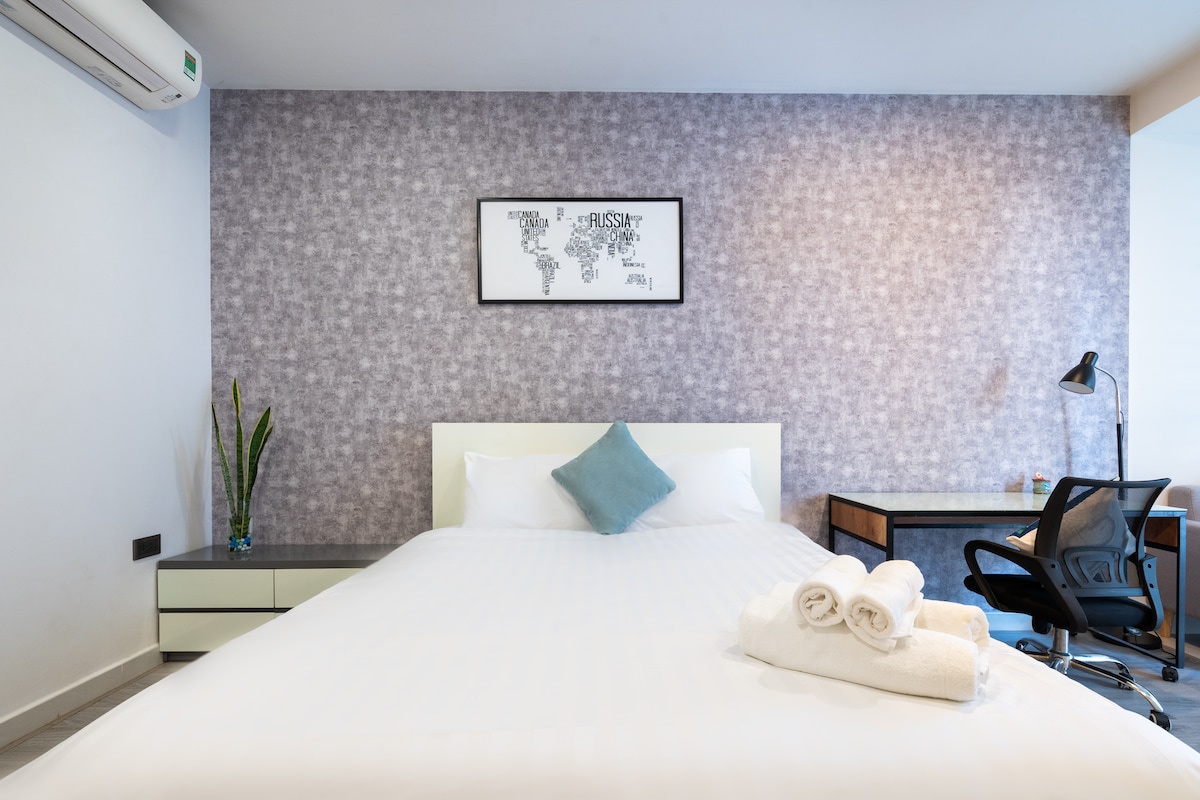 Tutto è semplice in questo alloggio tranquillo e in posizione centrale. ☆ Monolocale 38 m², servizi completi, F.10 * Tranquillo, accogliente, con una bella vista dall'alto * Centro di D.7. Ci vogliono solo 10 minuti per D1. * A 3 minuti dal Lotte Mart, a 10 minuti dalla città coreana in taxi e con comodi negozi al piano terra. * Guardia di sicurezza e ascensore 24 ore su 24 * Palestra gratuita e piscina a sfioro. * Servizio taxi 24 ore su 24 (Grab taxi) * Acqua potabile, noodle e caffè alla data del check-in. * Servizi completi, wifi potente e aria condizionata. Ti diamo un caloroso benvenuto ♡