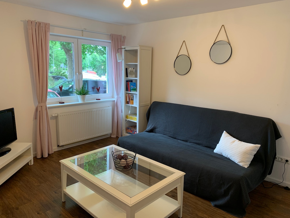 Saremo lieti di ospitarvi nel nostro piccolo appartamento! L'appartamento si estende per circa 45 mq. Nella camera da letto vi è un letto matrimoniale (140x200). Altre possibilità di dormire sono disponibili con il divano letto (180x200) nel soggiorno. L'appartamento è a vostra completa disposizione. Noi, in qualità di padroni di casa, viviamo nella casa principale accanto e siamo a vostra disposizione per qualsiasi domanda di persona o per telefono. Un parcheggio si trova proprio davanti all'appartamento.