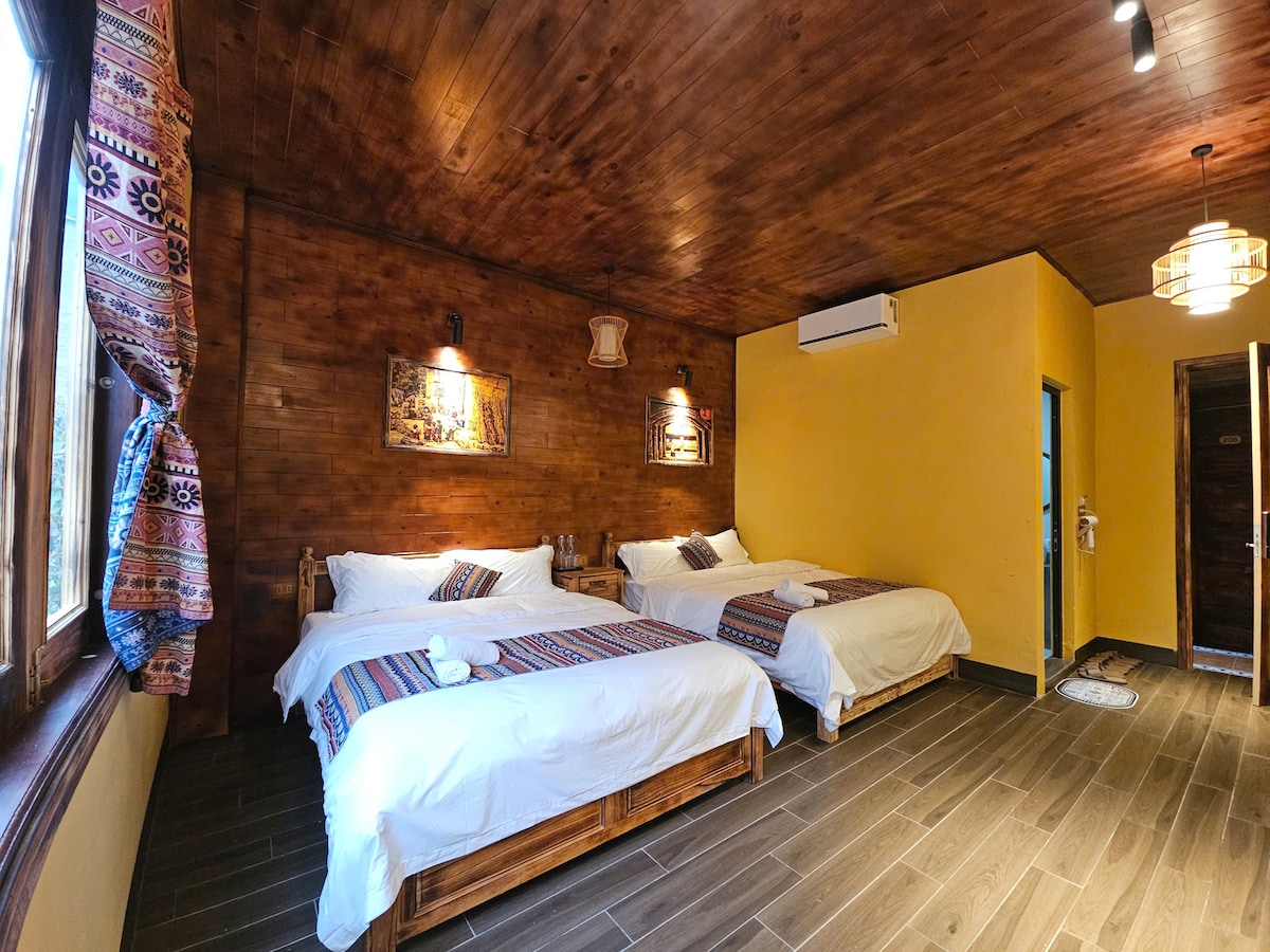Camera doppia Deluxe di 26 m² con bagno privato e colazione a buffet gratuita. Dall'ultimo piano del lodge, questa camera si apre sulla vista più mozzafiato: i tradizionali tetti Hmong che si fondono con il vasto scenario montano. Silenzioso, luminoso e perfetto per guardare l'alba e le nuvole che si spostano. A soli 50 metri dal mercato Hmong e circondato da sentieri escursionistici, piste ciclabili e rafting in bambù, l'Aya Lodge offre una rara calma e una profonda connessione culturale.