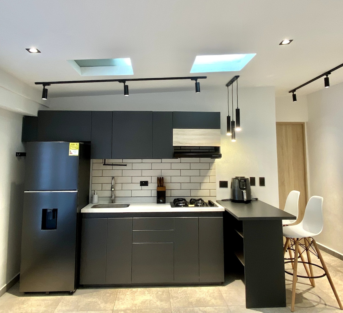 EL APARTAESTUDIO ESTÁ RECIÉN REMODELADO, DONDE SE MANEJÓ UN CONCEPTO DECORATIVO MODERNO CONTANDO CON MATERIALES QUE BRINDAN UN AMBIENTE COMPLETAMENTE SOBRIO Y ARMONIOSO, LO QUE INCENTIVA A LA PAZ Y EL DESCANSO DE NUESTROS VISITANTES Y HUÉSPEDES.
