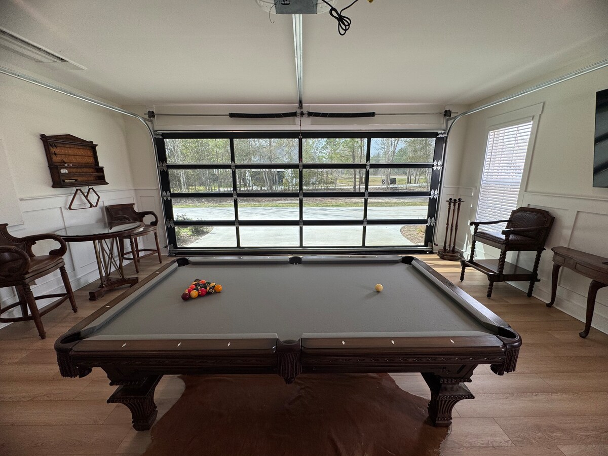 Questa è una meravigliosa casa di 185 metri quadrati. 3 camere da letto/2 bagni con uno studio, soggiorno, sala da pranzo, cucina e lavanderia, più un portico anteriore completo con altalena e sedie a dondolo, un patio posteriore e pergola con posti a sedere e altalena, e un posto auto coperto per 2 auto e un vialetto di ghiaia su 5 acri circondati da una fattoria di pini taeda. Offriamo internet in fibra ad alta velocità/Wi-Fi. Abbiamo 2 smart TV con lettore DVD e giochi da tavolo. La nostra cucina è ben attrezzata per la maggior parte delle esigenze di cottura.