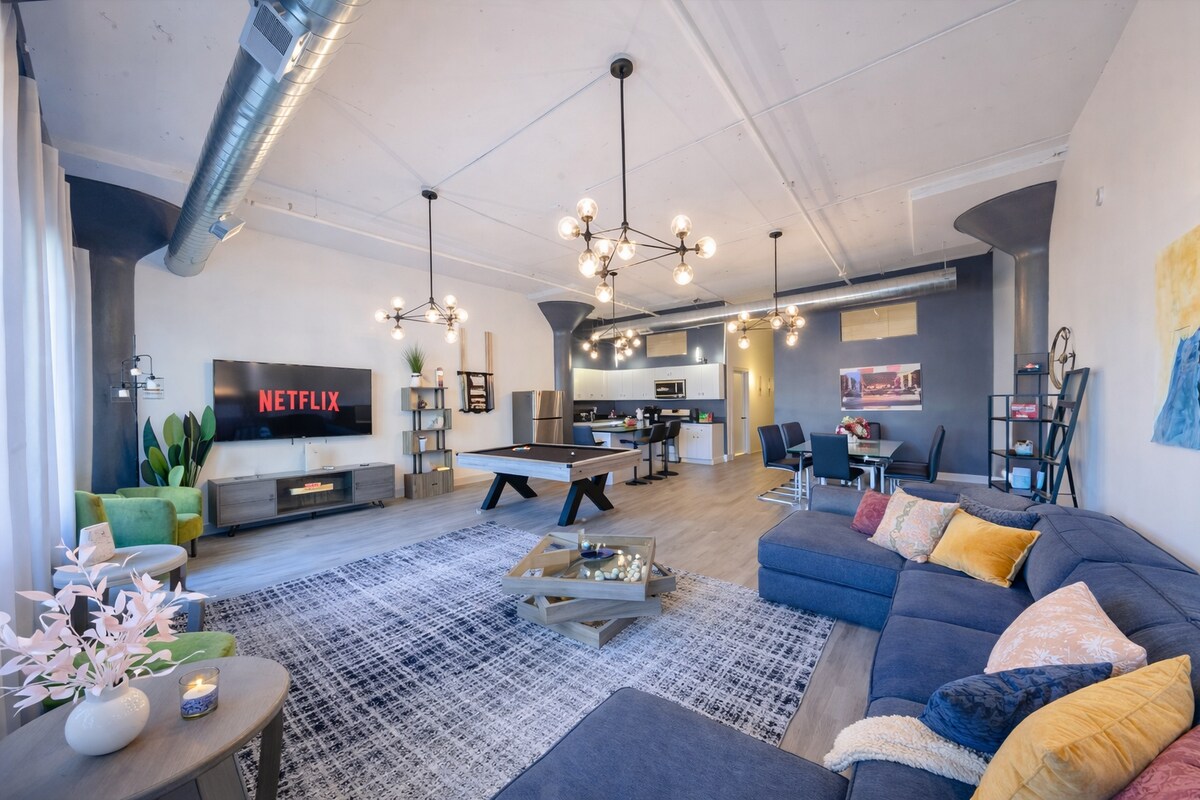 Welcome to your spacious 5-Bedroom South Loop suite, perfectly located just steps from McCormick Place Convention Center. Designed for large groups, business travelers, and families, this 2,800 sq ft luxury retreat combines the comfort of a private home with the convenience of a hotel. Enjoy skyline views, Smart TVs in every bedroom, a pool table, gym access, and a location that makes exploring Chicago perfect ⭐ Known for cleanliness, easy check-in, great communication, and spacious design.