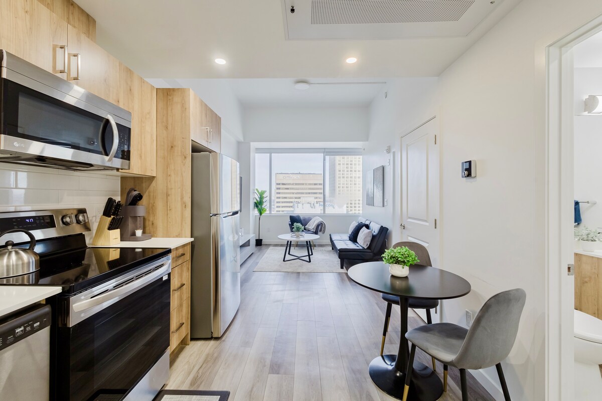 Qui troverai un alloggio elegante e di prima qualità nel centro di Edmonton, con parcheggio sotterraneo/riscaldato/custodito GRATUITO incluso per 1 veicolo. Vicino a trasporti, Rogers Place, al centro commerciale City Center, a ristoranti, negozi di liquori e al River Valley. Internet Gigabit ultraveloce. Aria condizionata nell'unità. New York Style 1 camera da letto 2 letti matrimoniali (Queen & Double) appartamento ha tutto ciò di cui hai bisogno, tra cui lavanderia in suite, Netflix, cucina in piena regola con tutti i servizi essenziali. Include l'abbonamento a Sportnet per guardare le partite degli Oilers e dei Jays!