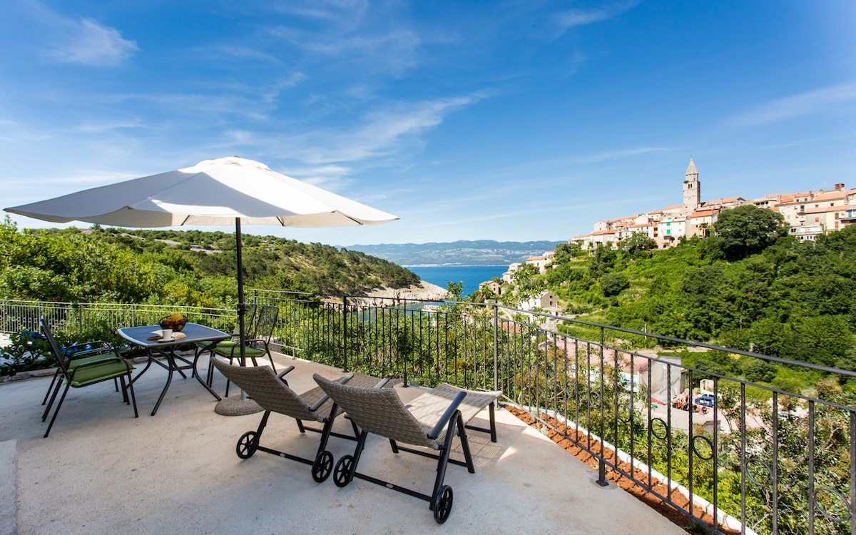 La splendida posizione tranquilla con vista sul mare e sul centro storico di Vrbnik rendono questo appartamento ideale per una vacanza romantica. Puoi goderti la tua terrazza con vista sul mare e sul centro storico. L'appartamento si trova al piano terra di una casa privata. Gli ospiti hanno a disposizione Wi-Fi e aria condizionata, oltre a un posto auto situato nel cortile.