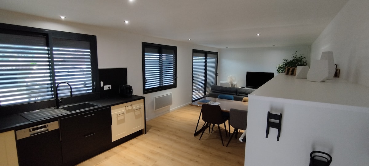Monolocale 18 m2 sulle alture di Aix-les-Bains al piano terra di una casa indipendente con 1 solo posto auto privato sul lato della strada. Situato a 1,8 km dal centro della città (25 minuti a piedi) 1,5 km dalle terme, a 5 km dal lago e a 20 km dalla stazione sciistica di Revard. Monolocale dotato di angolo cottura con piano cottura, cappa, forno a microonde, mini forno, frigorifero, macchina per il caffè e lavatrice. Posto letto matrimoniale 140x190. Sono forniti lenzuola e asciugamani. Bagno con doccia e WC privato.