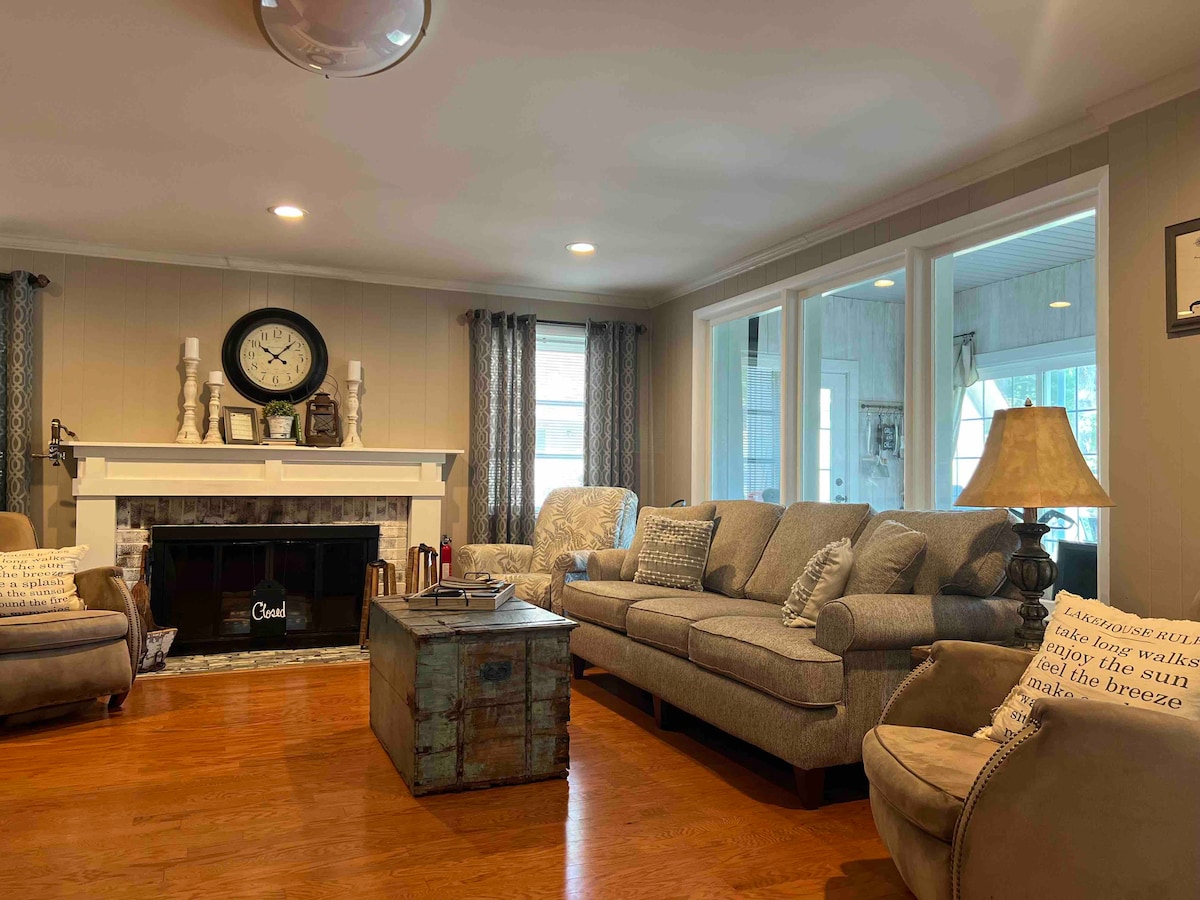 Enjoy looking at the lake from almost every room in the house. Wake up in any bedroom with a view of the lake. Have coffee on the porch while the sun rises, walk straight into the lake from the boat landing, enjoy relaxing on the patio, lay out in the sun, jump off the private dock, build a sandcastle on the beach, and then finish your day with a campfire in the fire pit while still looking at the lake with the moon shining down.