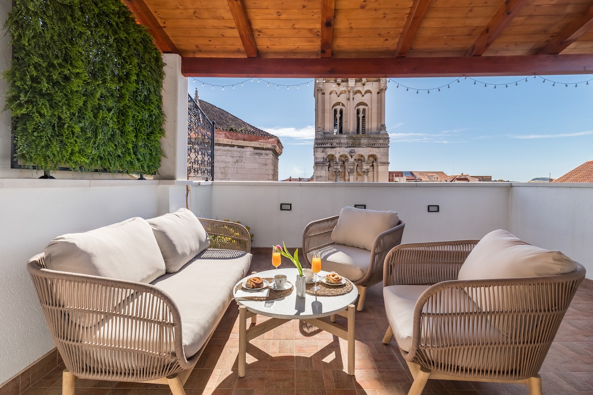 Veig Palace four-star apartments are two ("twin") new luxury studio apartments on two floors. They are designed to accommodate two people, and consist of a bedroom, bathroom and living room with kitchenette, and the walled courtyard, which is a rare privilege of private accomodations in the explicit city center.They are located in the center of ancient part of town at 250 m from the Diocletian palace.
