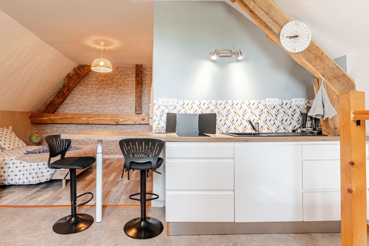 Rilassatevi in questo alloggio tranquillo ed elegante. Piccolo loft attrezzato e arredato con gusto. Situato in posizione ideale per godersi la baia di Mont St Michel, perfetto per serate romantiche, accogliente e molto ben attrezzato, fascino assicurato. Per 2 o 4 viaggiatori. Per voi motociclisti, accesso gratuito al cortile chiuso da un cancello .