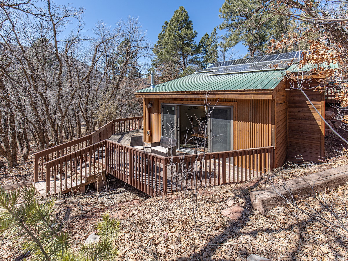 Chalet remoto di 28 metri quadrati alimentato a energia solare nella foresta di ponderosa, a 11 km dalla città di Mancos, vicino al Mancos State Park. Ottimo posto dove soggiornare in zona durante il tuo viaggio nel sud-ovest o al Parco Nazionale di Mesa Verde. Un luogo piacevole per gli ospiti che vogliono staccare la spina, rilassarsi e godersi un'esperienza rustica nella natura selvaggia all'aperto. Ottimi sentieri per escursioni, birdwatching, sci di fondo e ciaspolate! Nota: se l'inverno è rigido, avrai bisogno di un veicolo 4x4 o a trazione integrale per accedere al quartiere.