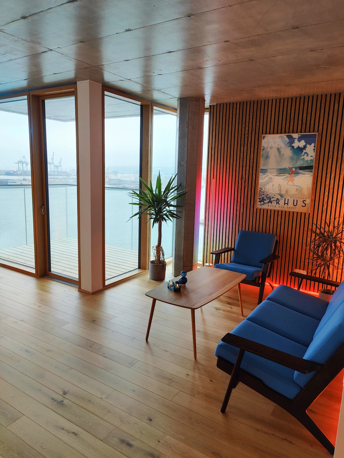 Indisturbato e in alto sull'acqua, proprio di fronte al porto di Aarhus. Vista spettacolare sul porto e sulla baia, con splendide albe. Due camere da letto: una matrimoniale e due letti singoli. Spazio abitativo compatto che combina cucina moderna, zona pranzo e soggiorno. Bagno spazioso. Balcone avvincente per la colazione al sole o un drink serale. Parcheggio privato nel seminterrato. Goditi la tranquillità o l'atmosfera della nuova zona portuale alla moda, oppure raggiungi il centro città a piedi in 20 minuti. Biancheria da letto e da bagno incluse.