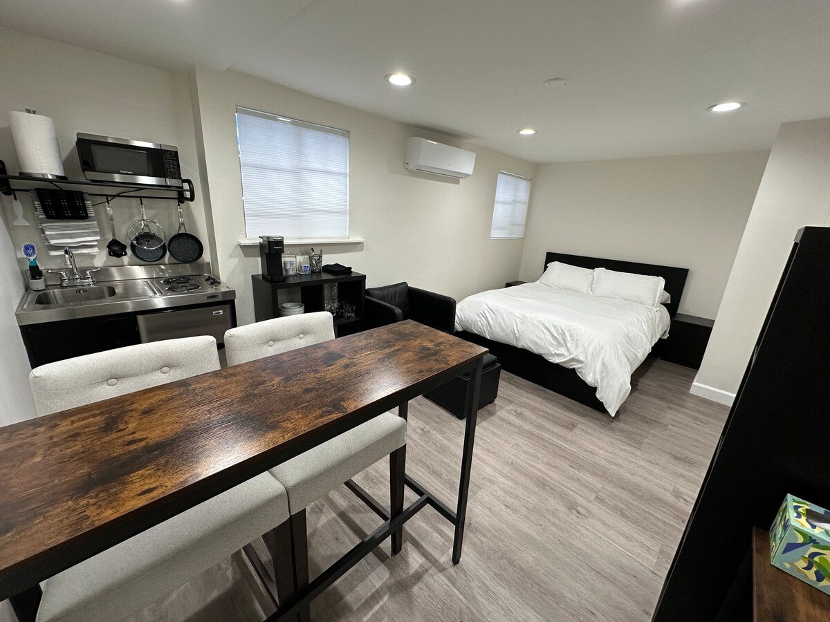 Il nostro bungalow privato di 60 metri quadrati offre un ingresso indipendente, parcheggio gratuito e la libertà di andare e venire a proprio piacimento. Goditi una camera da letto con letto matrimoniale California King, un soggiorno con divano letto singolo e un'accogliente biblioteca sul retro con libri, giochi e un divano letto estraibile a grandezza naturale, perfetto per più di 4 ospiti! Lo spazio dispone di una moderna cucina e di una lavatrice interna per la tua comodità. La tua casa ideale lontano da casa in un rifugio tranquillo e autonomo!