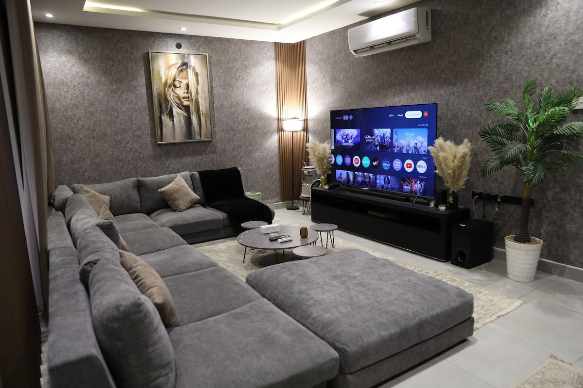 Una moderna ed elegante cucina indipendente e un salotto con accesso intelligente,dotato di un comodo materasso da letto, home theater,bar, luci dimmerabili, deodorante per ambienti, schermo intelligente da 60 pollici collegato a Internet 5G e una sessione lounge molto confortevole. Contiene servizi (frigorifero, forno elettrico,bollitore, macchina del caffè, forno a microonde,tazze e utensili) Numero di ospiti fino a 4 persone. Una posizione distintiva a nord del quartiere di Riyadh Kairouan, vicino a: 2 minuti attraverso King Salman 4 minuti via King Fahd Road 18 minuti al viale. 20 minuti dall'aeroporto.
