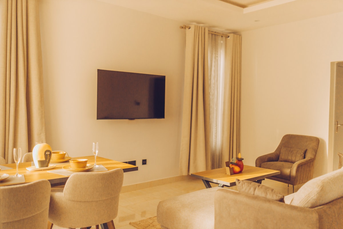 Enjoy the elegance of a modern era while staying in this Art Deco home. Beautifully decorated and spacious living room , a dining table fully fitted kitchen, and a stunningly unique tiled- bathroom. Our home has a fast and very reliable 24-hour WiFi Connectivity. We are 18 minutes away from the Sakumono Beach. We are also 25 minutes away from the Kotoka International Airport. We offer Airport pickup at a very little fee.